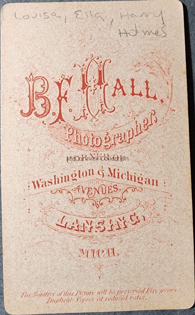 Carte de visite photograph of siblings Louisa, Ella, and Harry Holmes by Lansing photographer Hall.