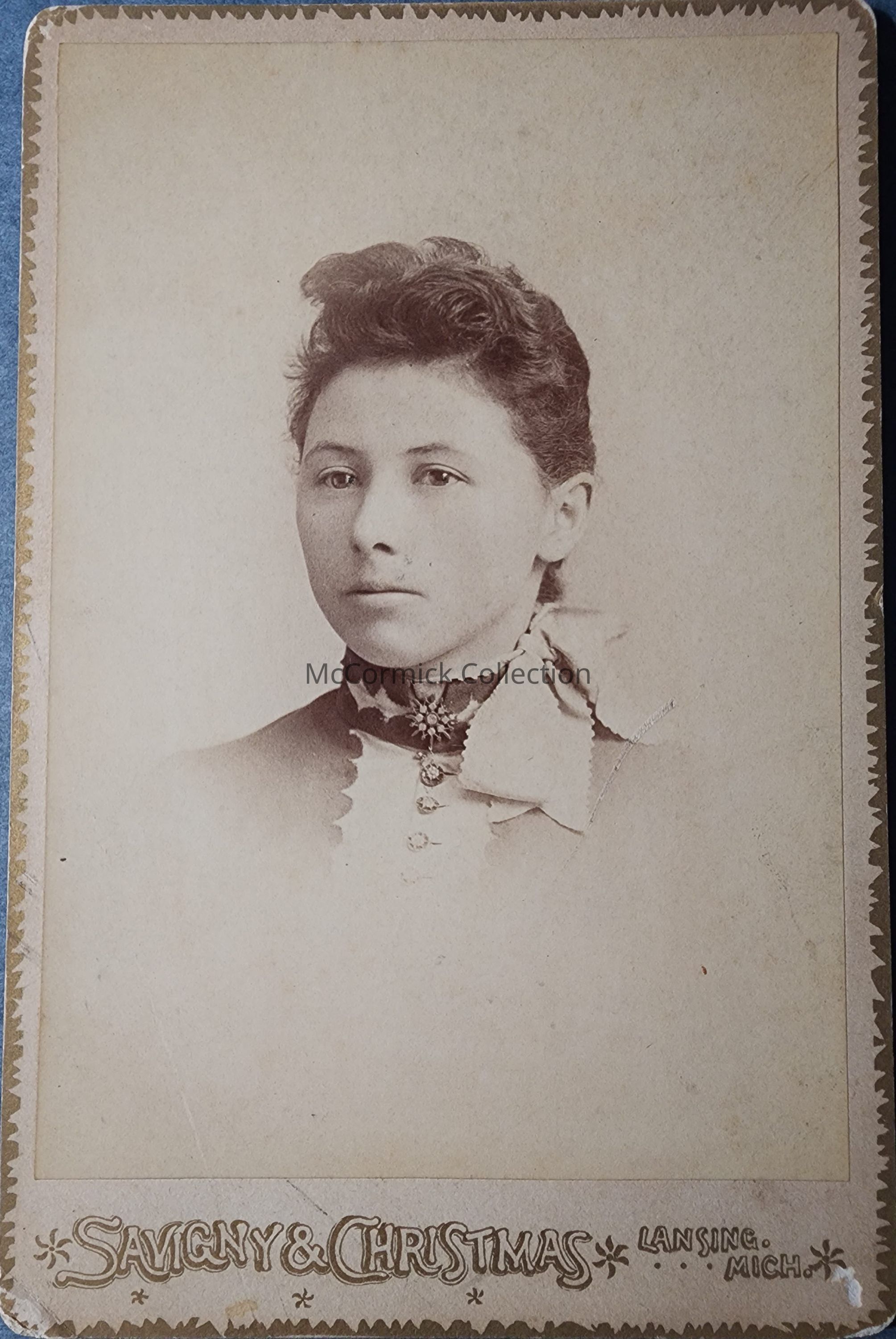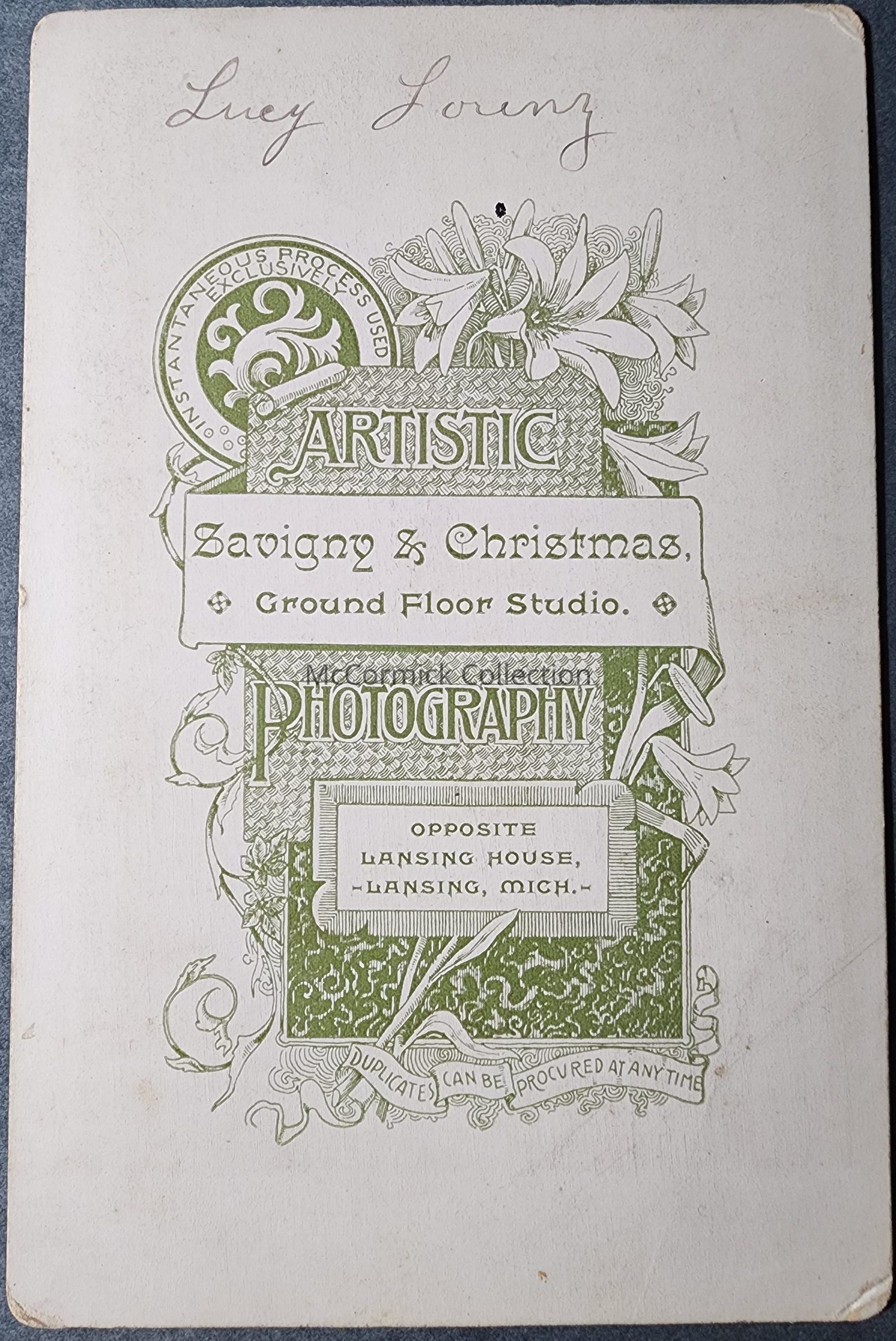 Cabinet card photograph of Lucy Lorenz by Lansing photographer Savigny and Christmas.