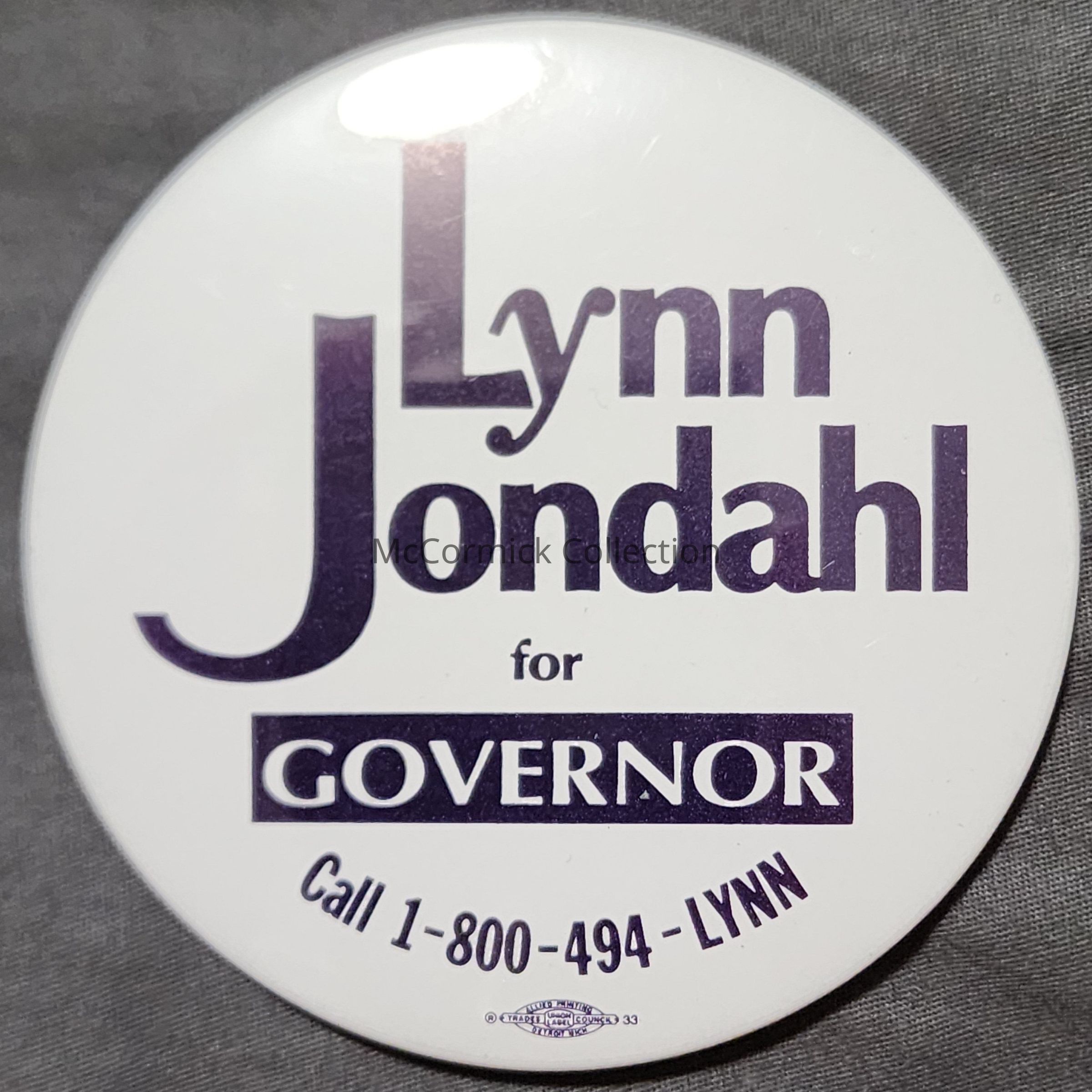 A 3" blue and white political button for H. Lynn Jondahl for Governor, 1994. Includes campaign phone number "Call 1-800-494-LYNN."