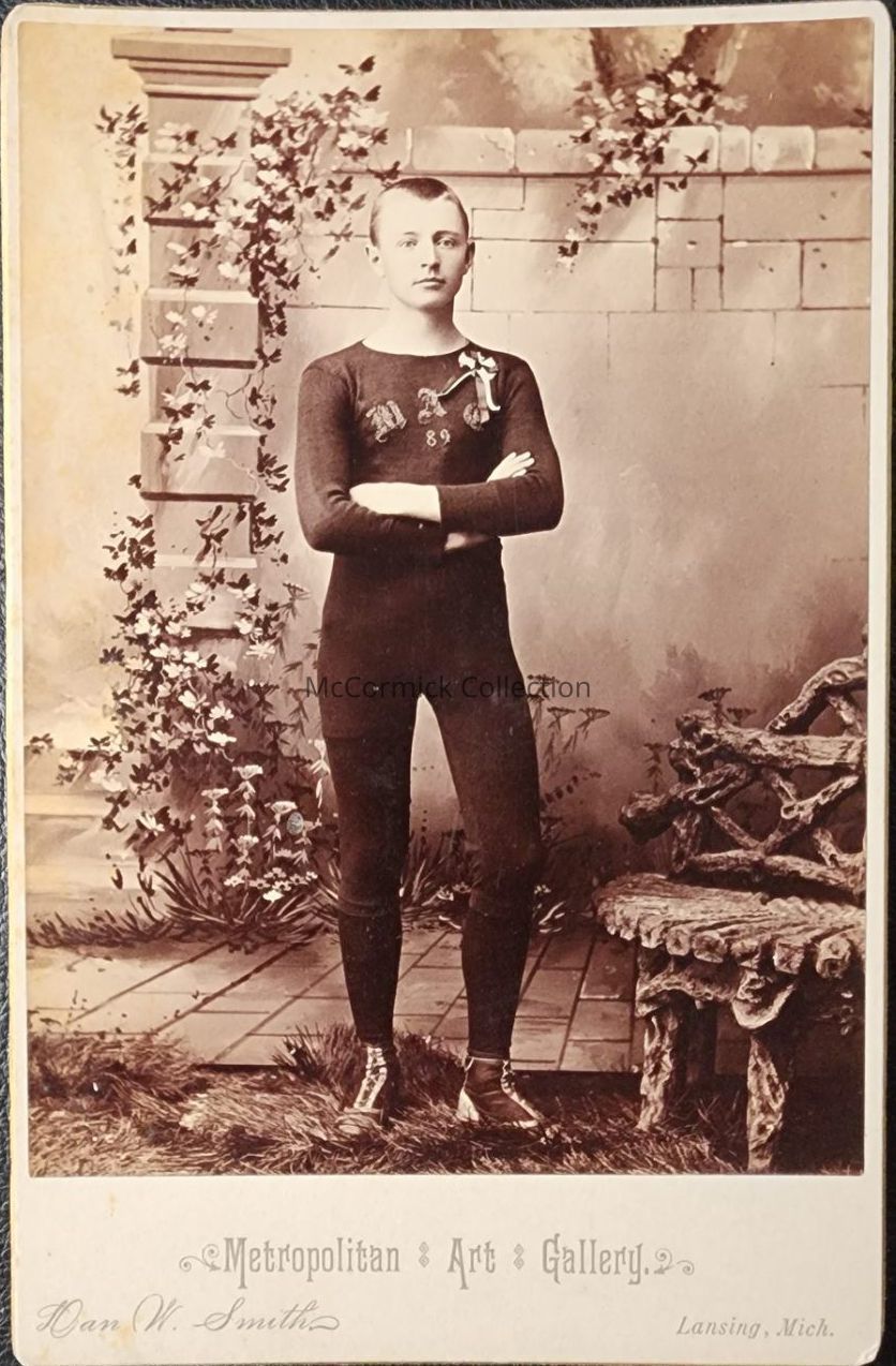Cabinet card photograph of an unidentified man dressed in a Michigan Agricultural College athletic uniform, with "MAC 89" on his chest. The photo was taken by Lansing photographer Metropolitan Art Gallery, Dan W. Smith.