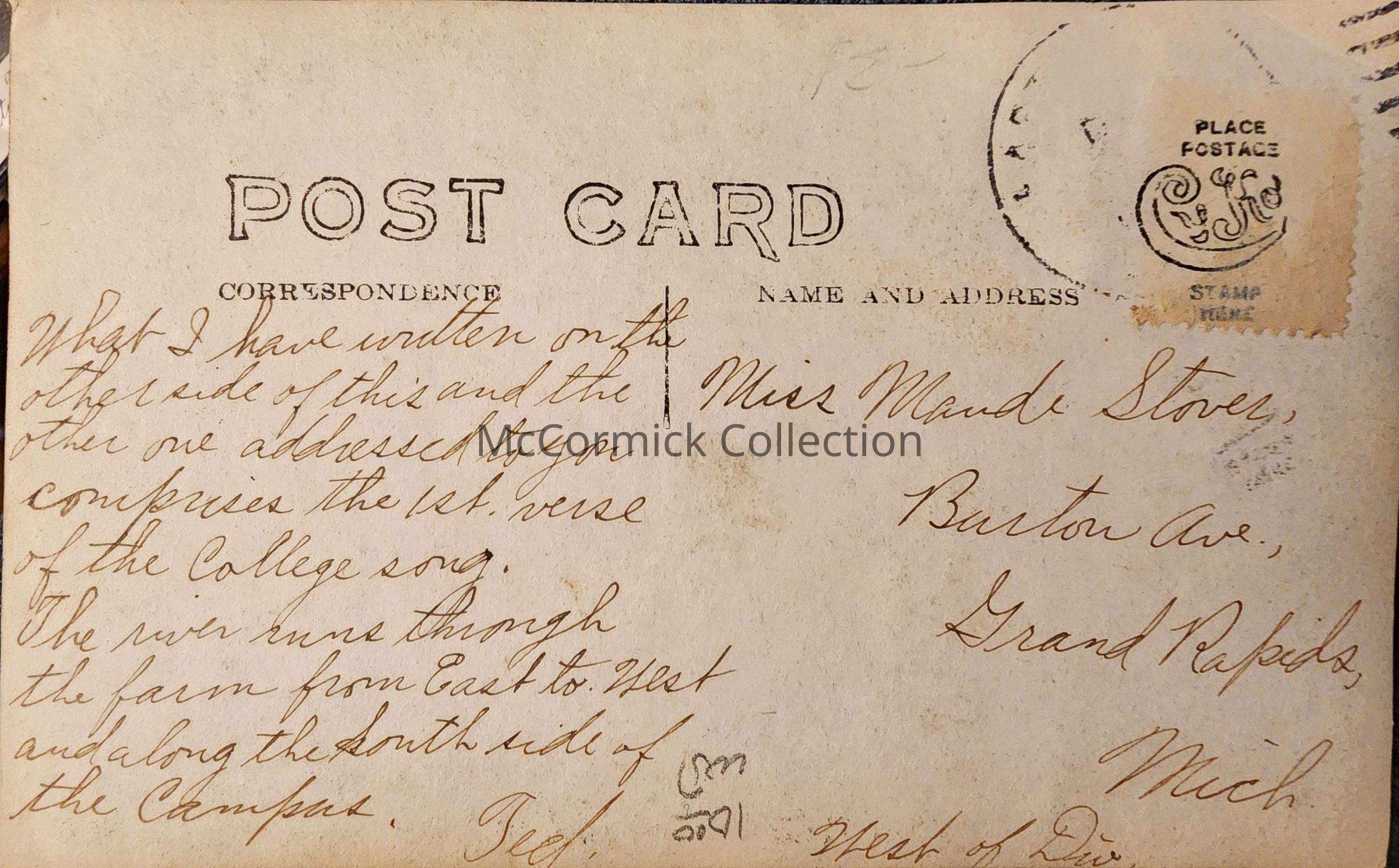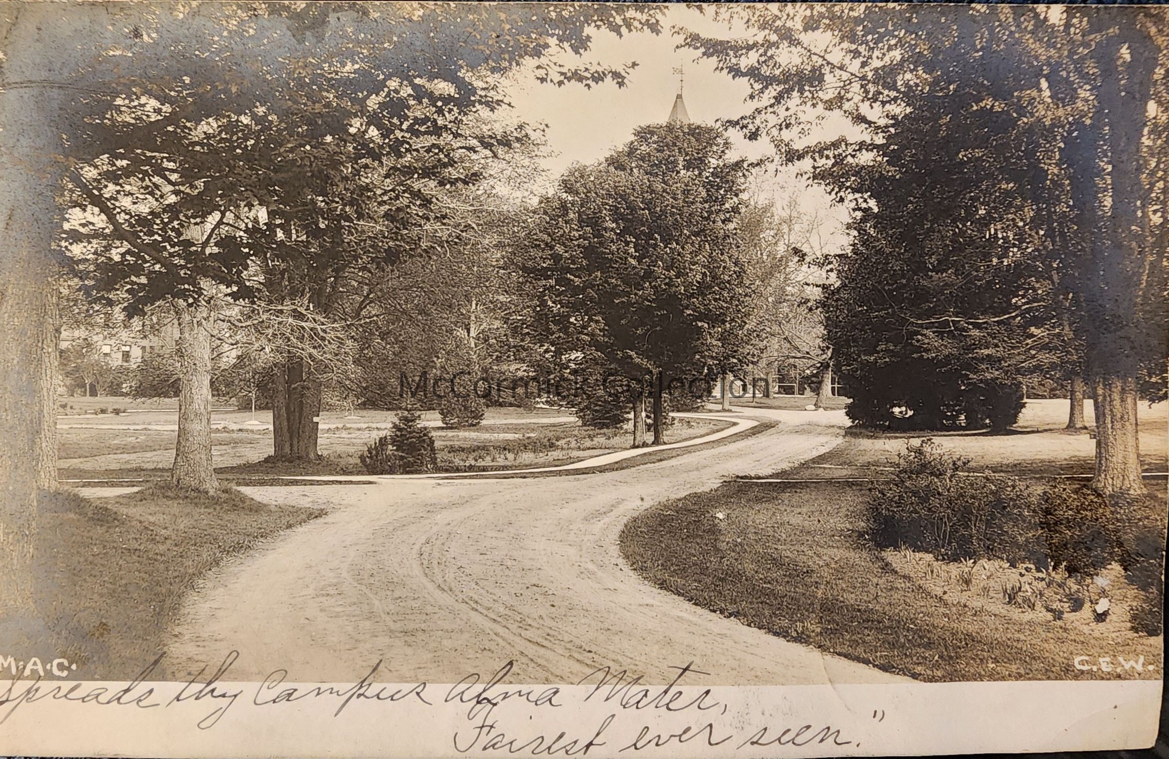 Portion of the Alma Mater: "Spreads thy campus alma mater, fairest ever seen" written on the front and explanation on back in message. Photo by East Lansing photographer C.E.W., Charles E. Walter.Made/Created
