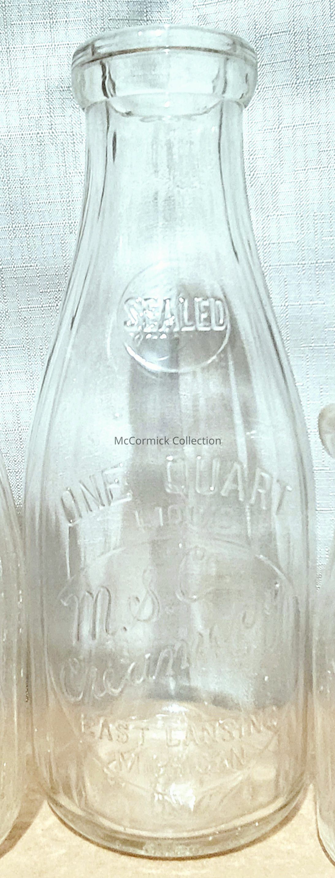 An embossed quart bottle with ridges and slug plate from the M.S.C. Creamery of East Lansing.