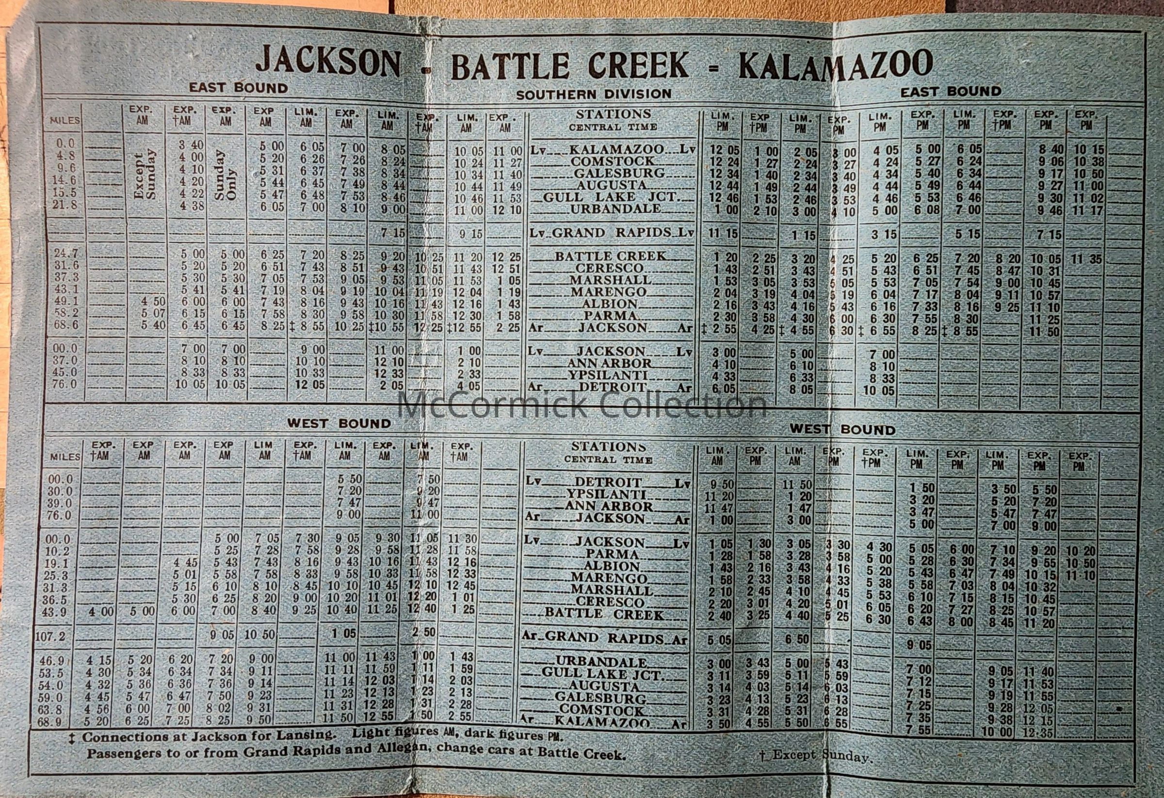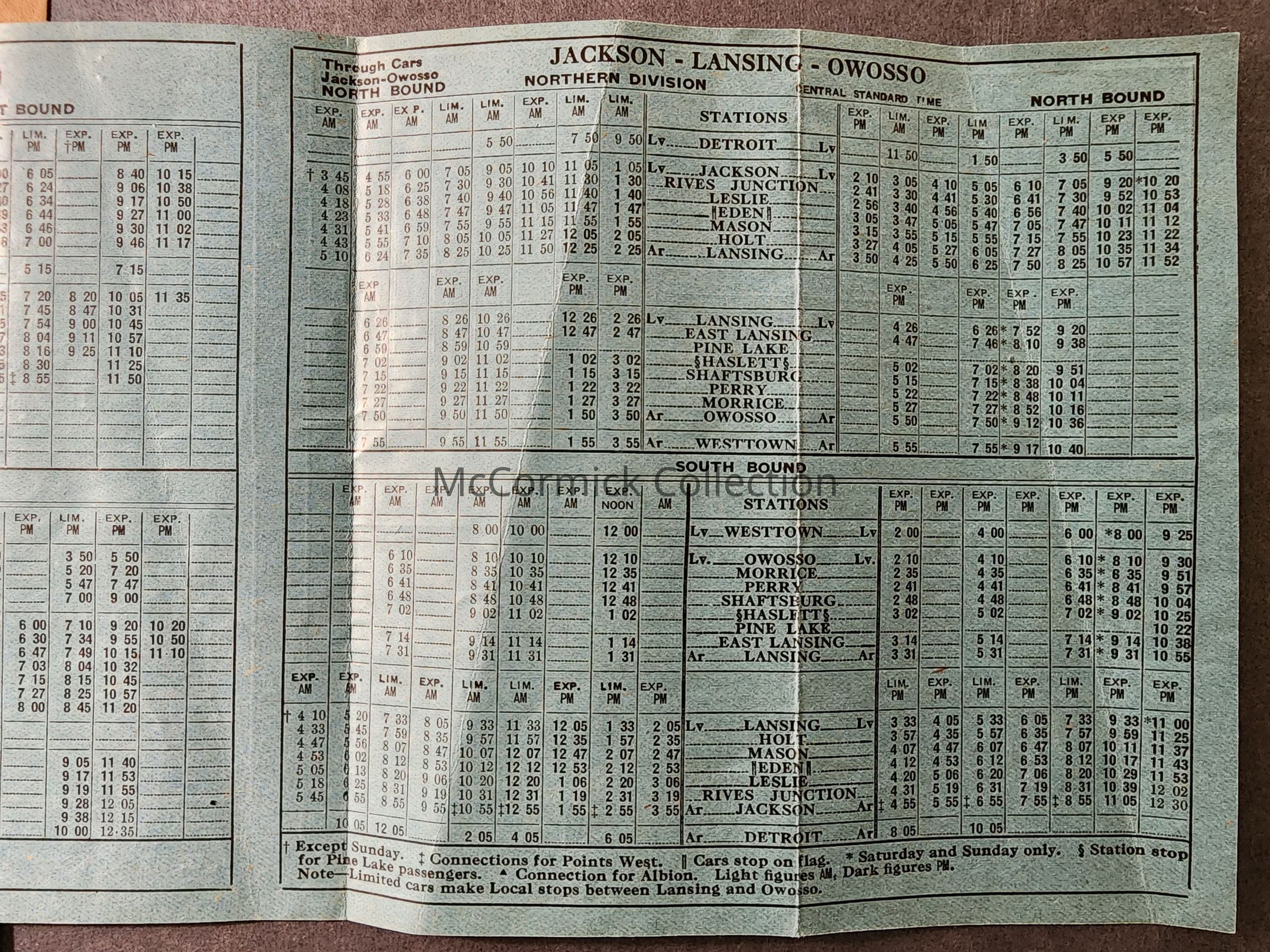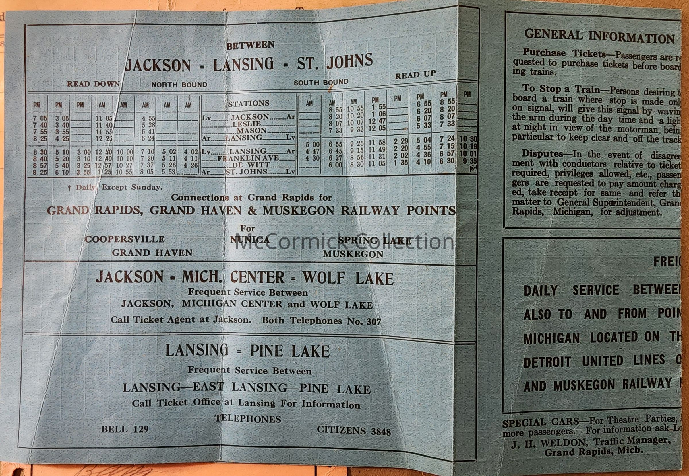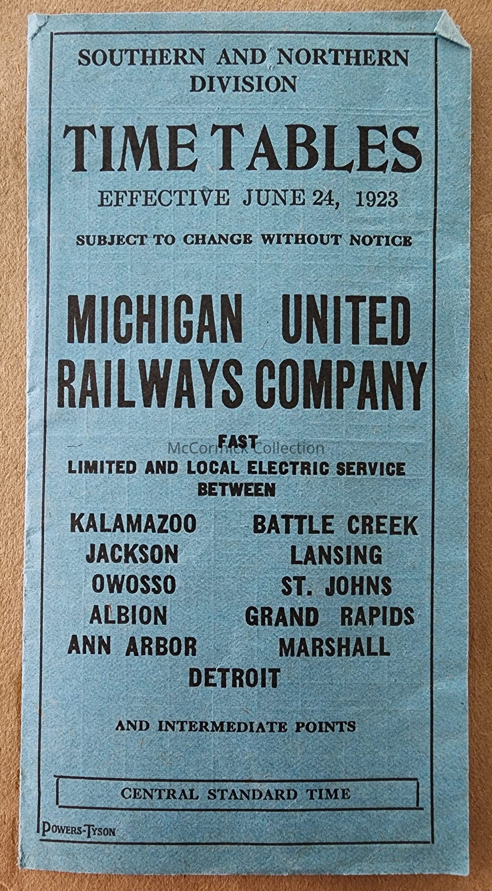 A timetable for the Michigan United Railways Company, or interurban, for the Lansing area in 1923. Attached to a single scrapbook page.