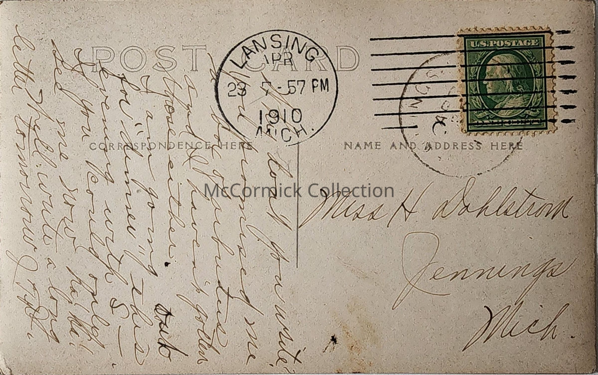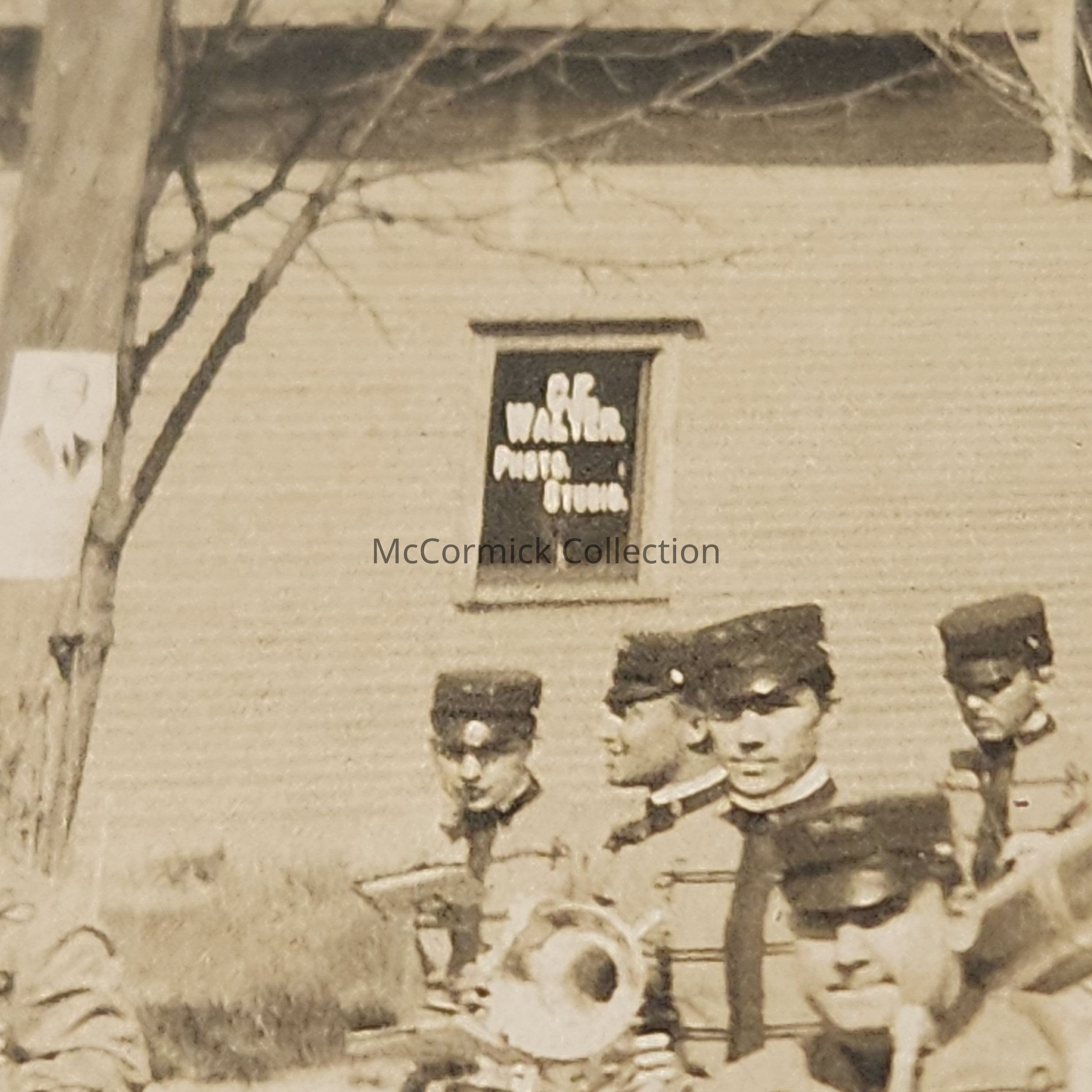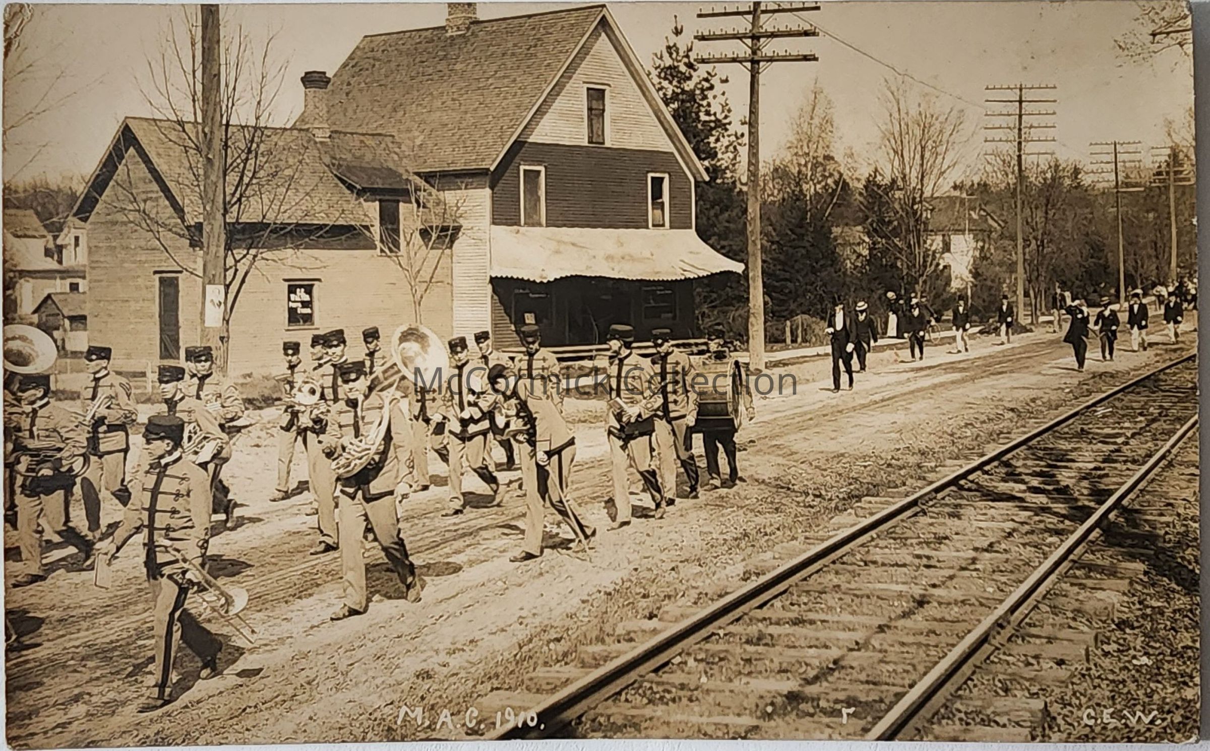 Real photo postcard of the Michigan Agricultural College Military Band marching on a street in East Lansing next to Interurban tracks. In the background is the photo studio of Charles E. Walter. Photo dated 1910, by CEW, Walter. Postally used.Made/Created