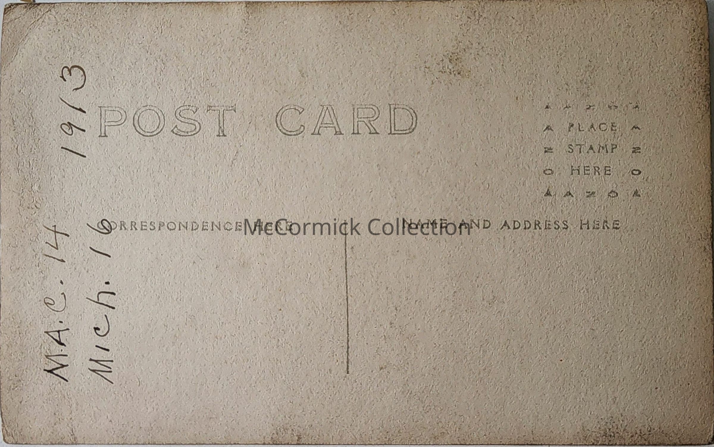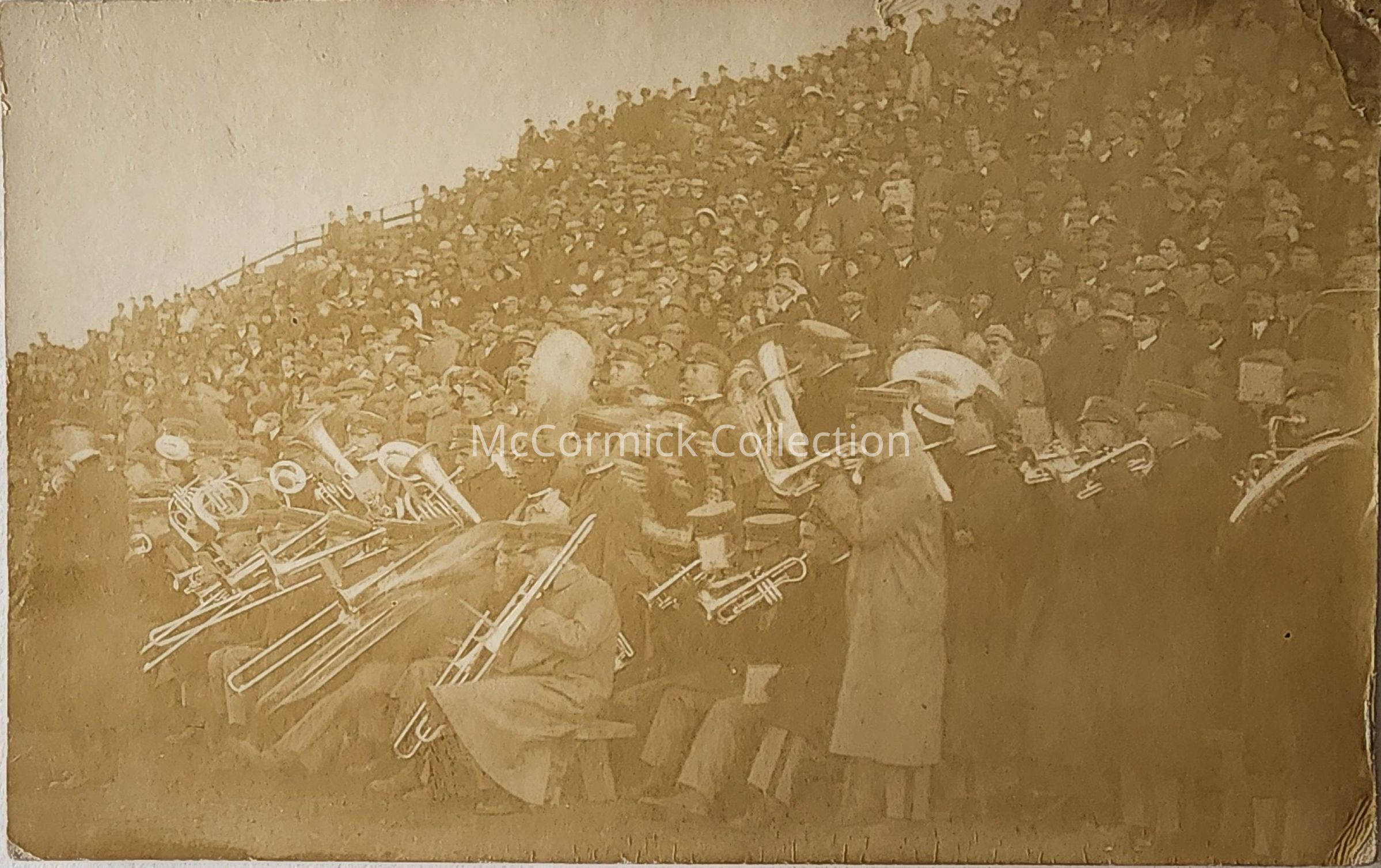Real photo postcard of the Michigan Agricultural College Military Band on the sideline of the Michigan vs MAC football game in 1913, at which MAC lost 14-16.