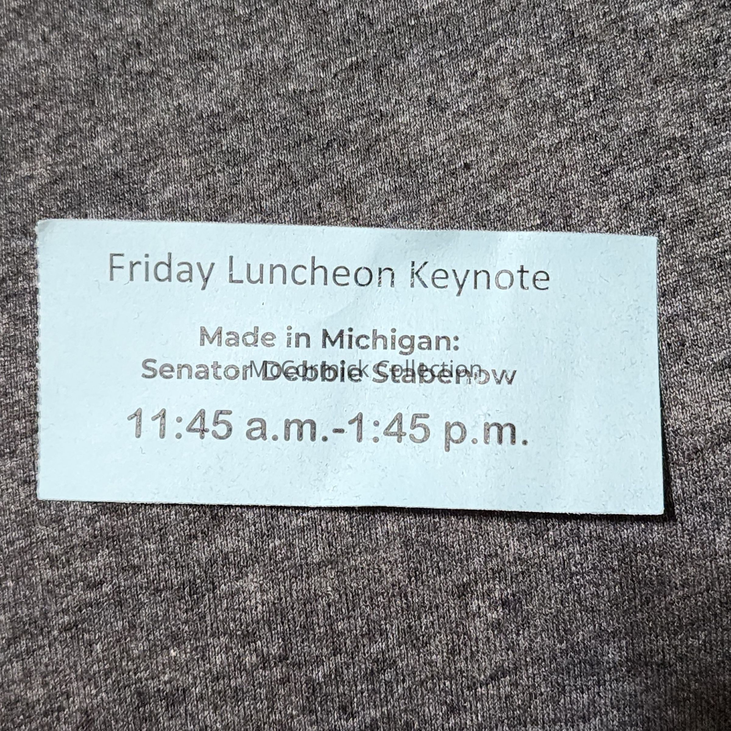 A March 2025 ticket stub from a luncheon held by the Historical Society of Michigan at Oakland University featuring a keynote address by recently retired U.S. Senator Debbie Stabenow.
