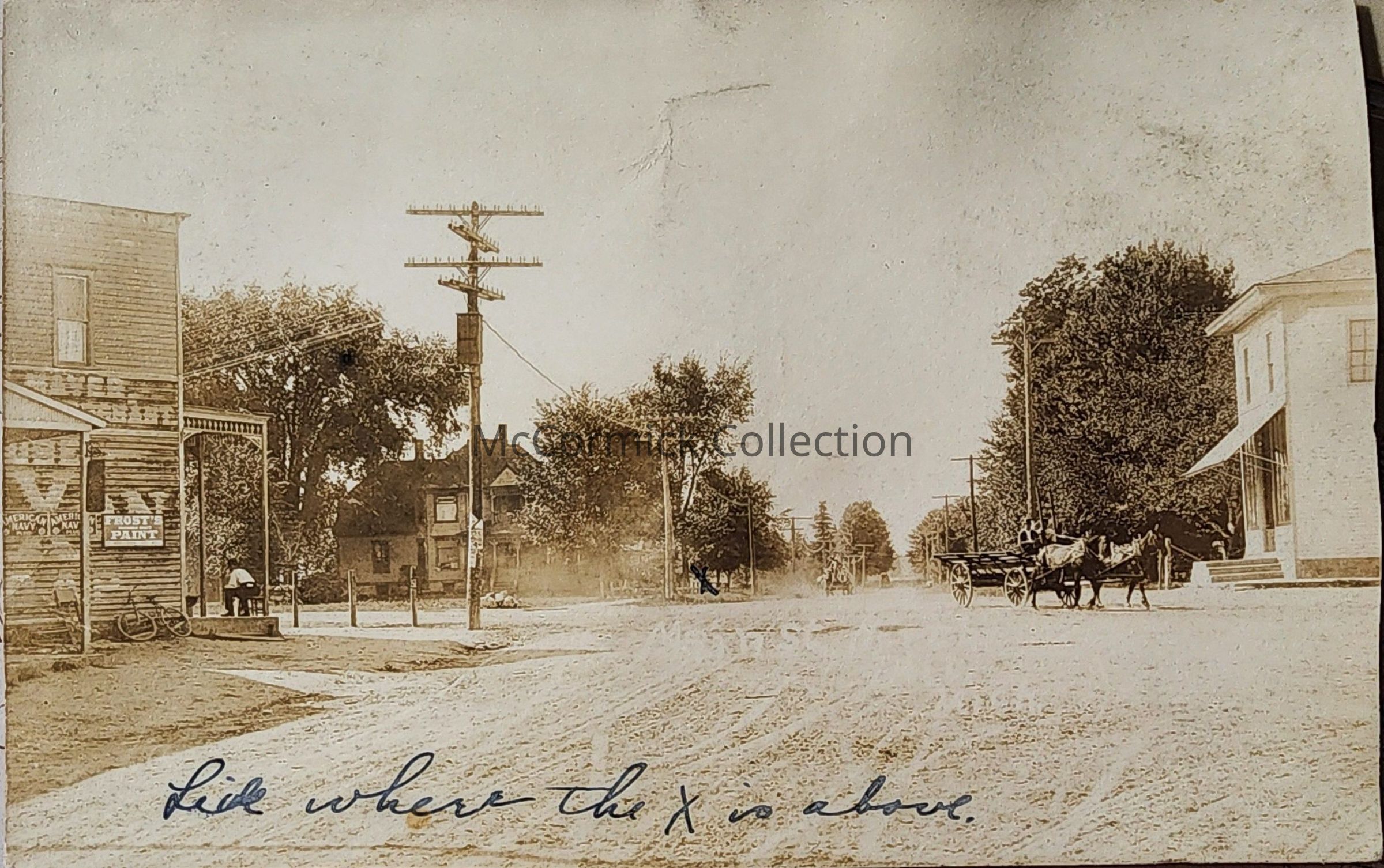 Real photo postcard of downtown Holt, Michigan, of Cedar Street at Holt Road, facing north. An X marks the home of the sender, Florence Thocker (sp). Postally used, Holt postmark.