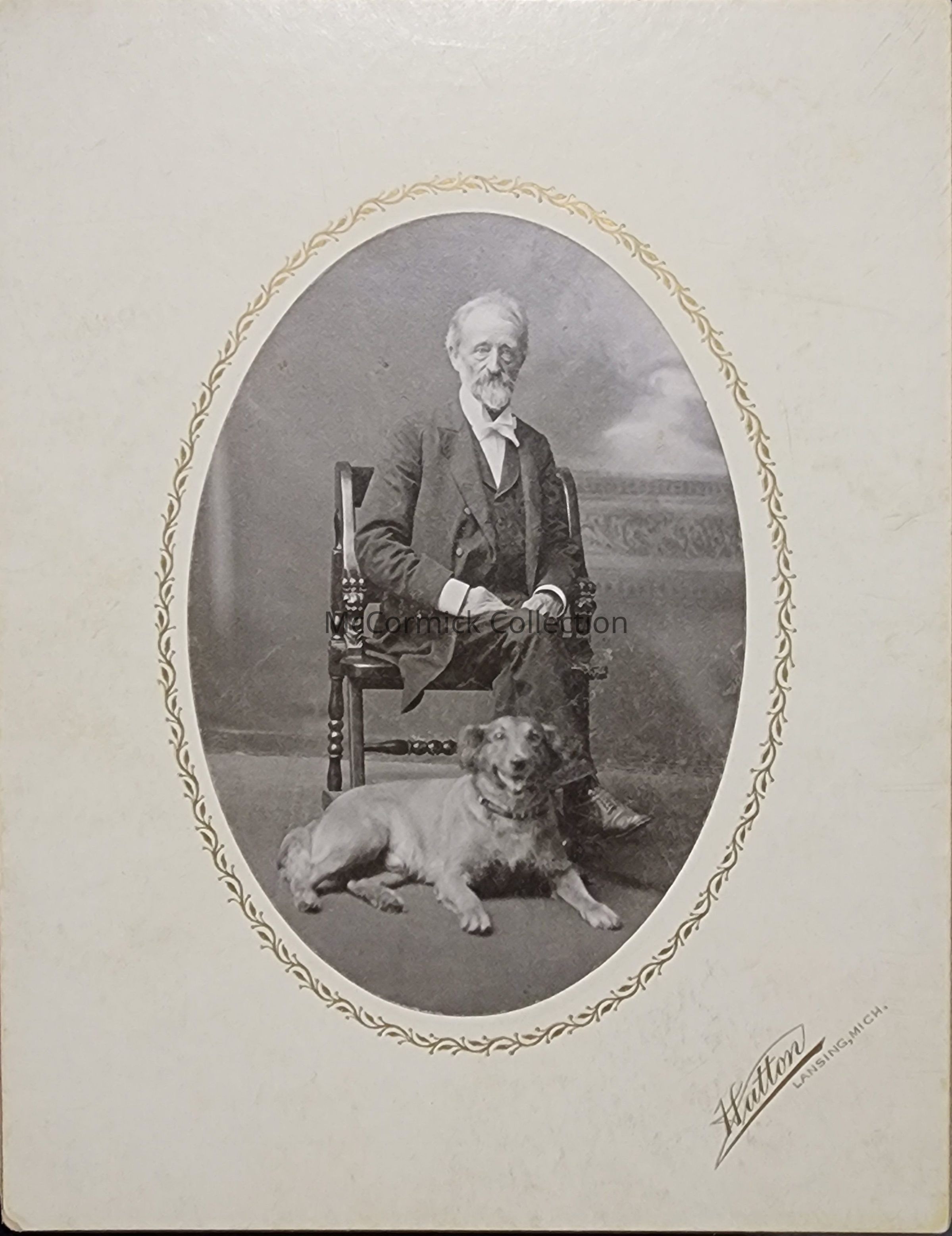 Card mounted photograph of a man with a dog taken by Lansing photographer Millard F. Hatton, circa 1898.