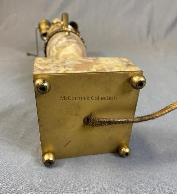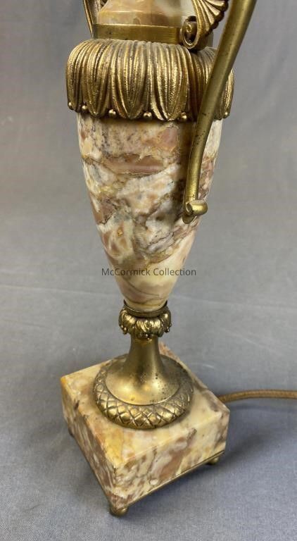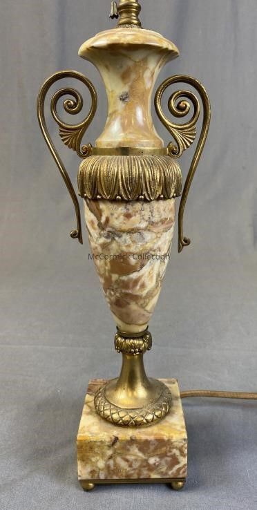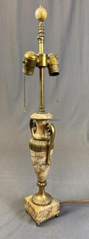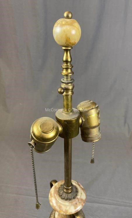 Marble table lamp with matching finial, 26" tall, with double sockets and pull chains. Circa 1920s stylistically. Said to be from R.E. Olds' Lansing mansion, acquired from the Smith Estate in Dimondale, direct descendants of Olds.