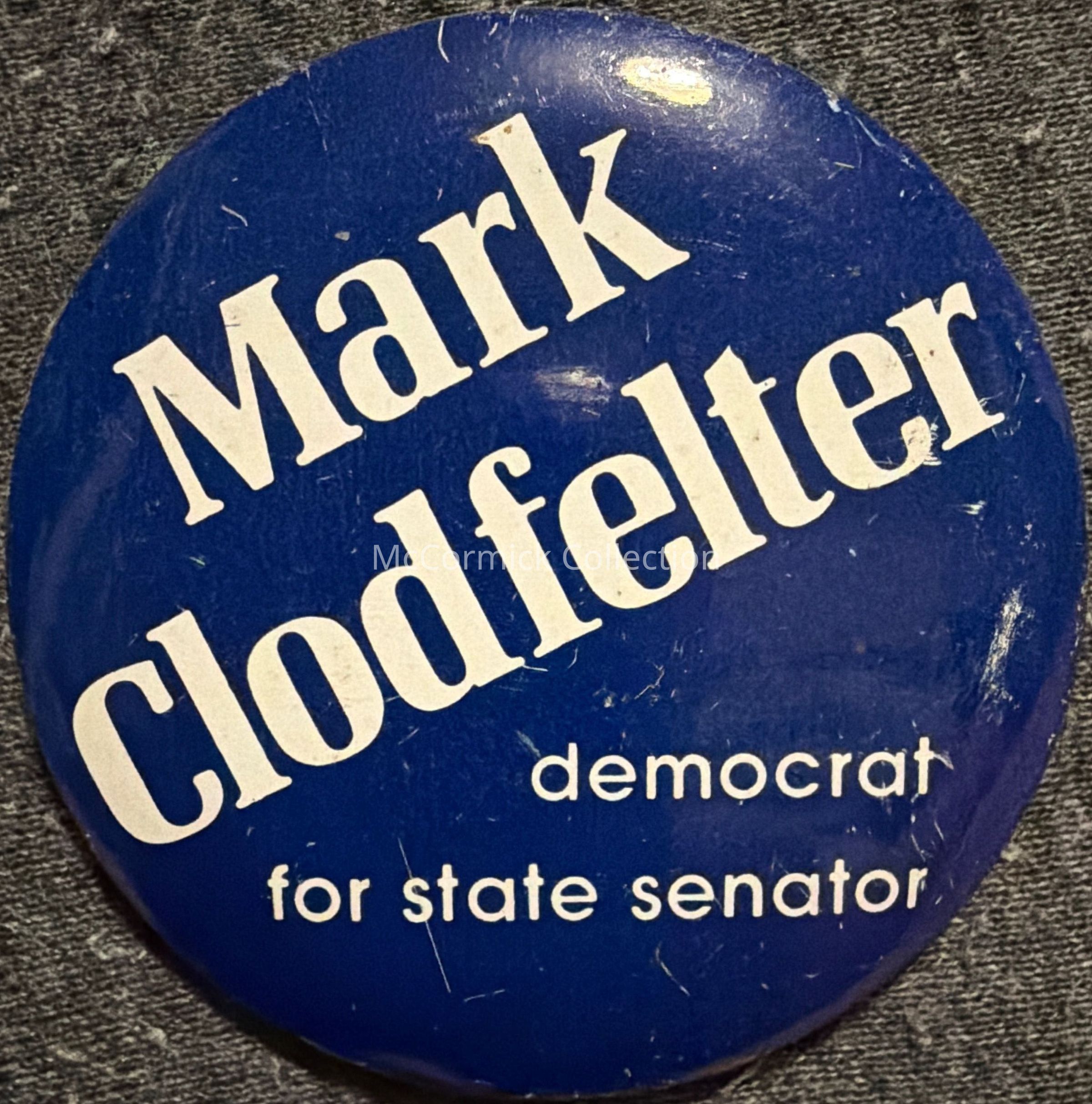A 2.25” blue and white political button for Mark Clodfelter, state representative running for State Senate, 1977.
