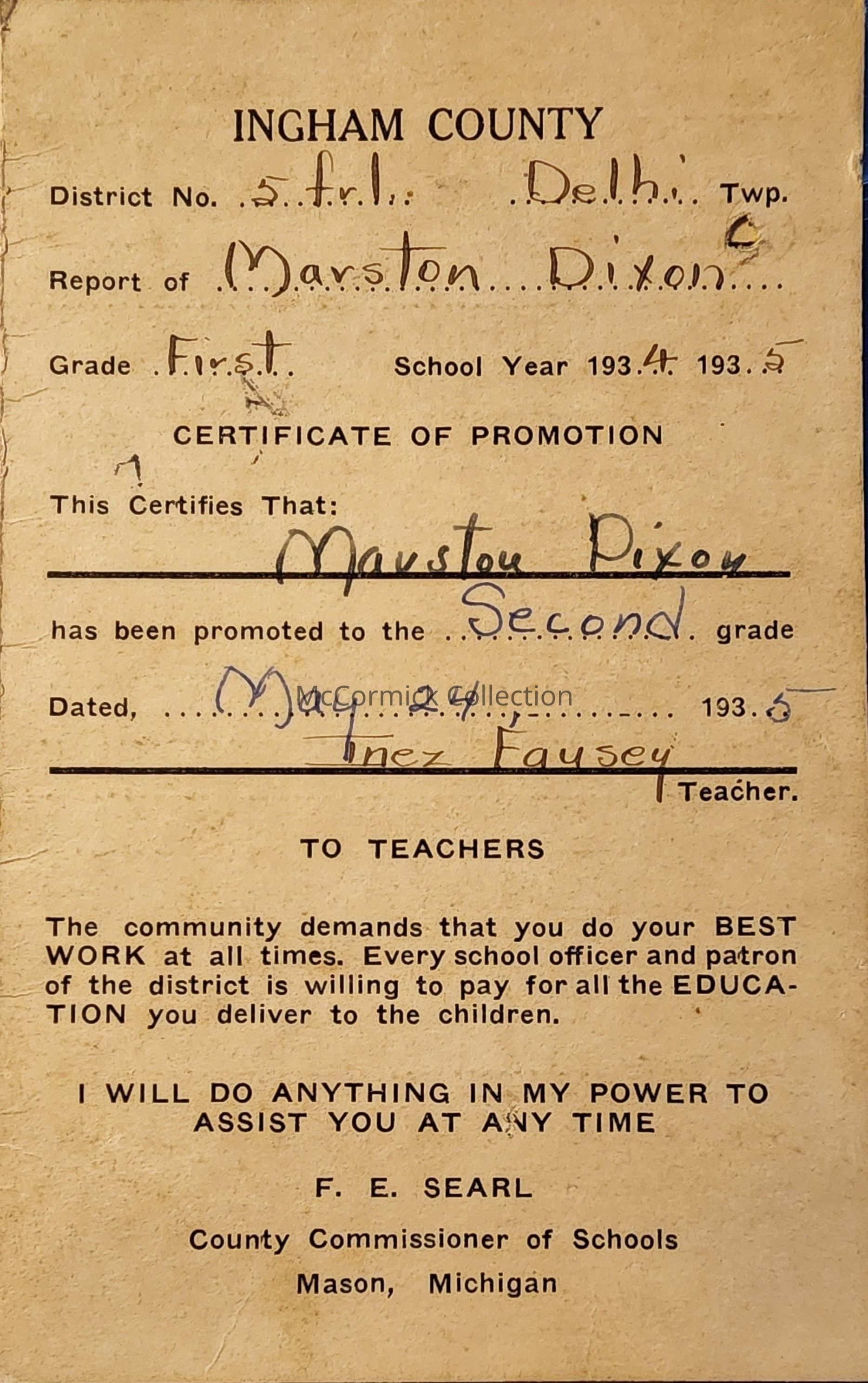 Marston Dixon, Ingham County School Report Card, 1934-35