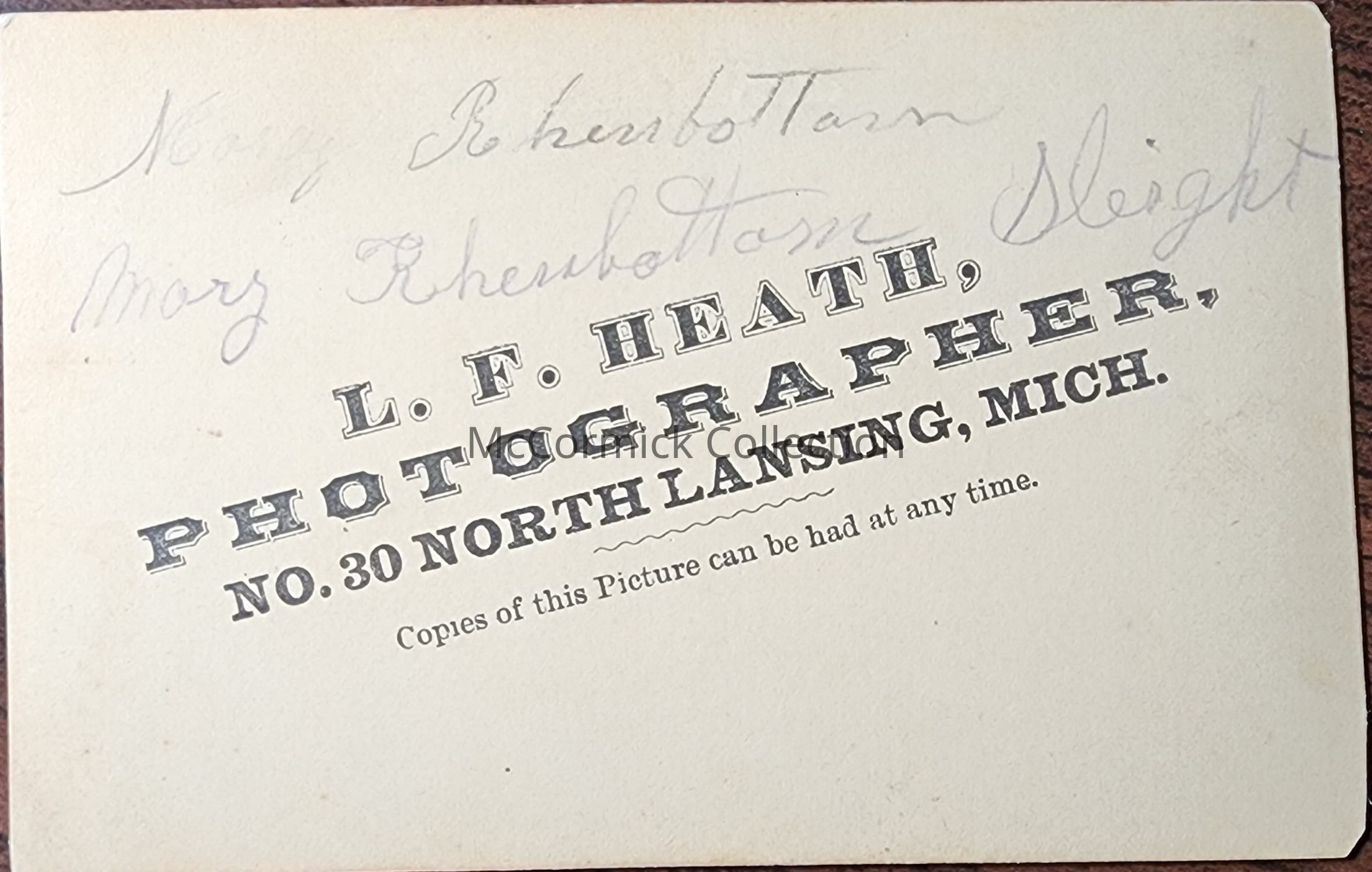 Carte de visite photograph of Mary Rehenbottom Sleight by Lansing photographer Heath.