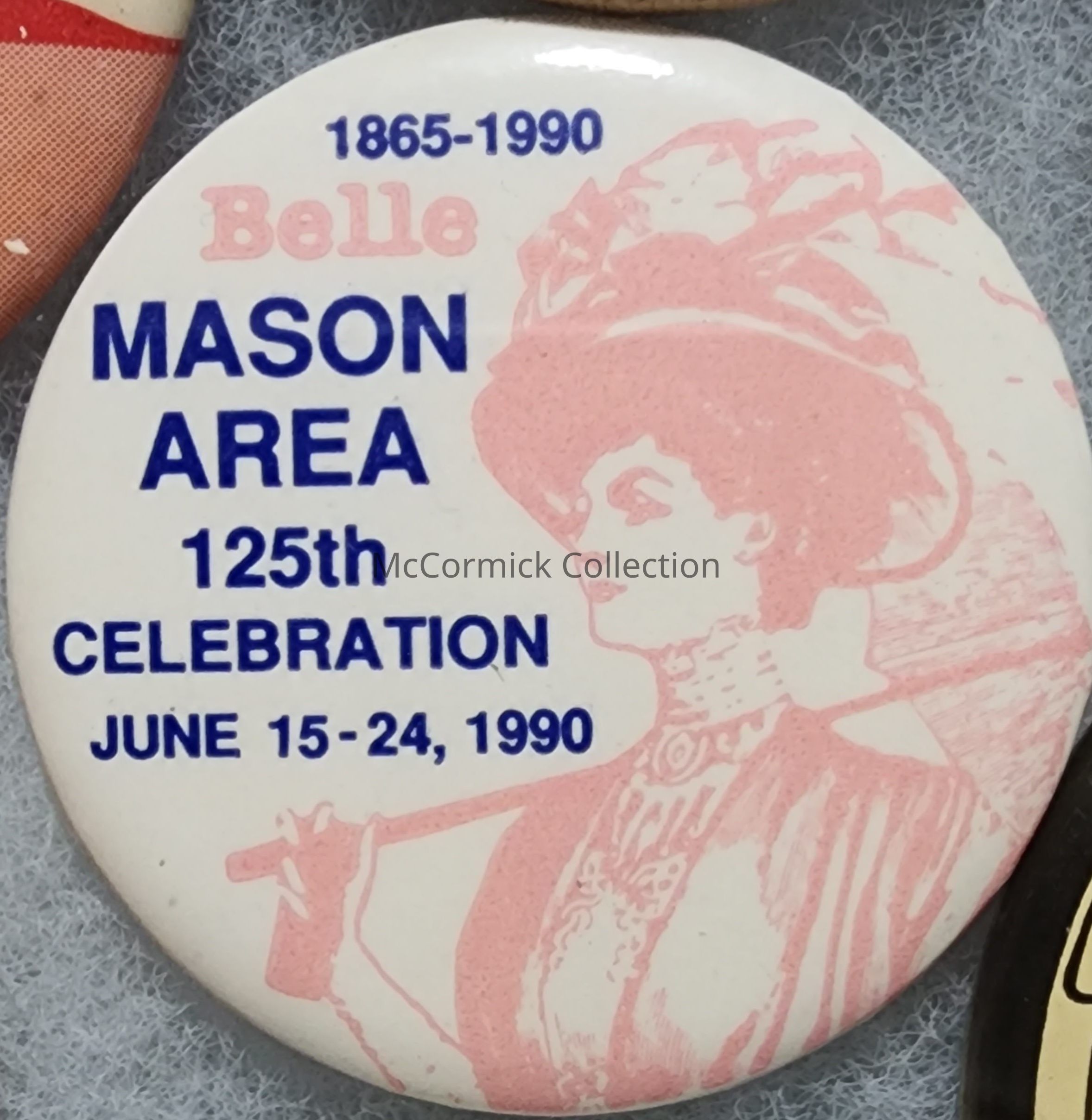 Button for a Belle of the Mason, Michigan, 125th anniversary celebration in 1990.