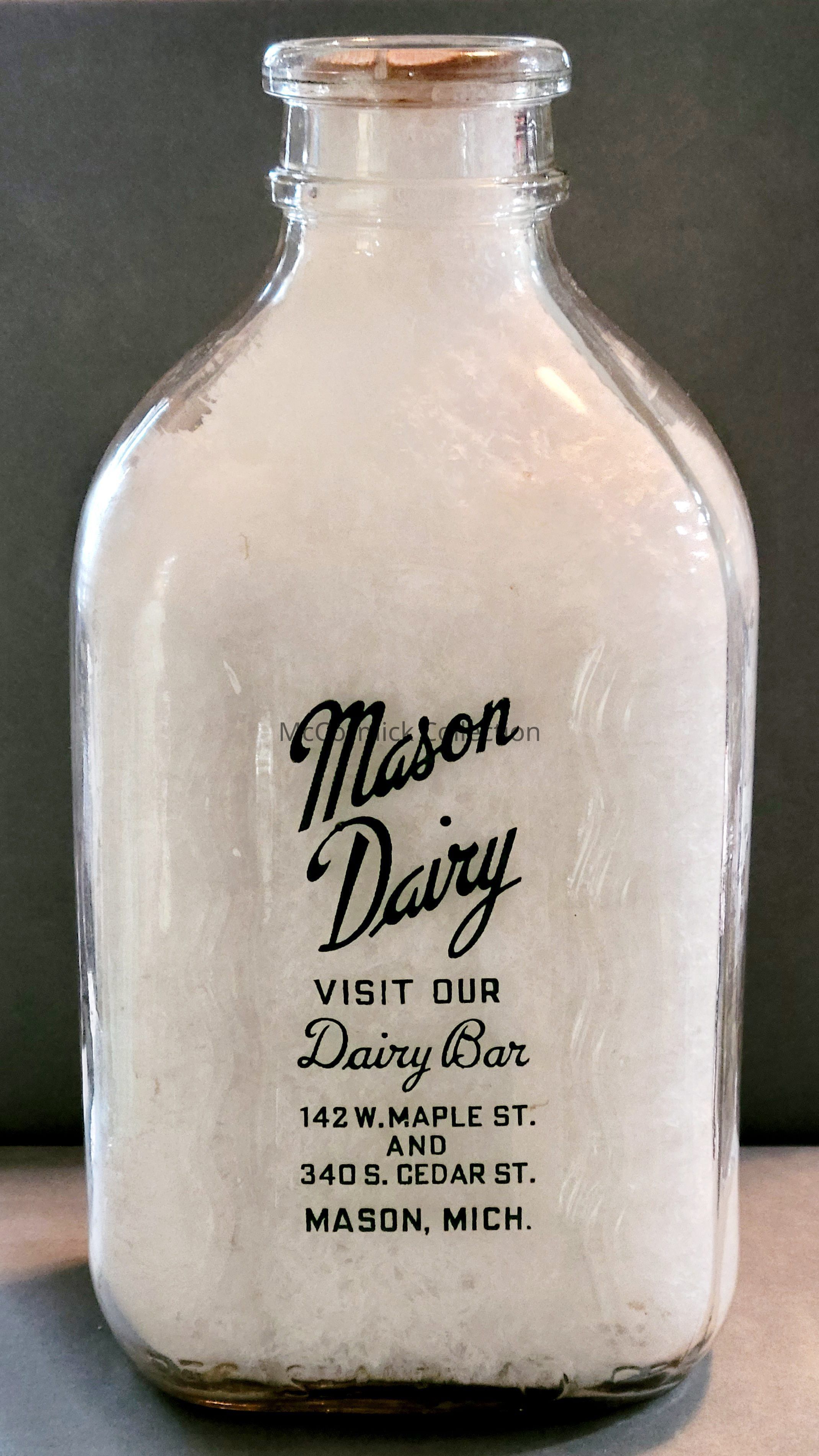 A green pyro half gallon bottle from the Mason Dairy with "Dairy Bar" slogan.