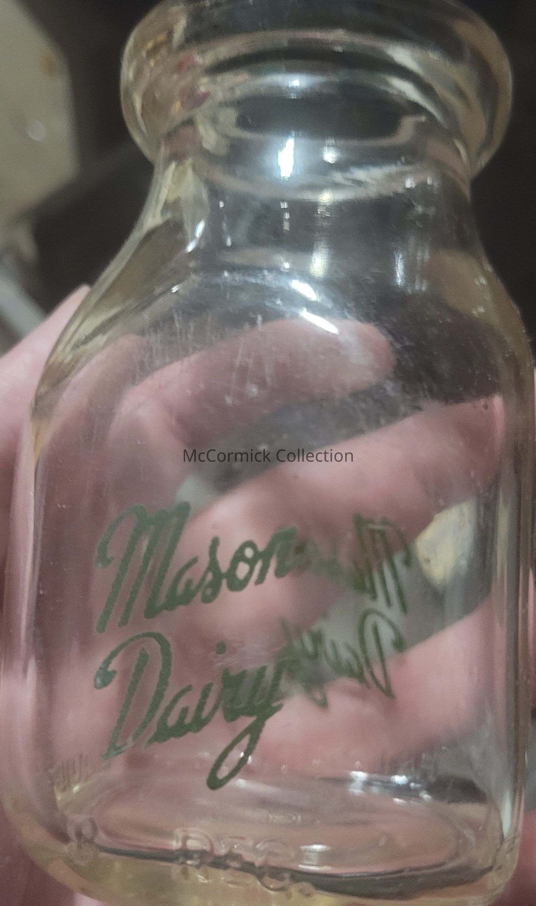 A square green pyro half pint from the Mason Dairy. Double sided.