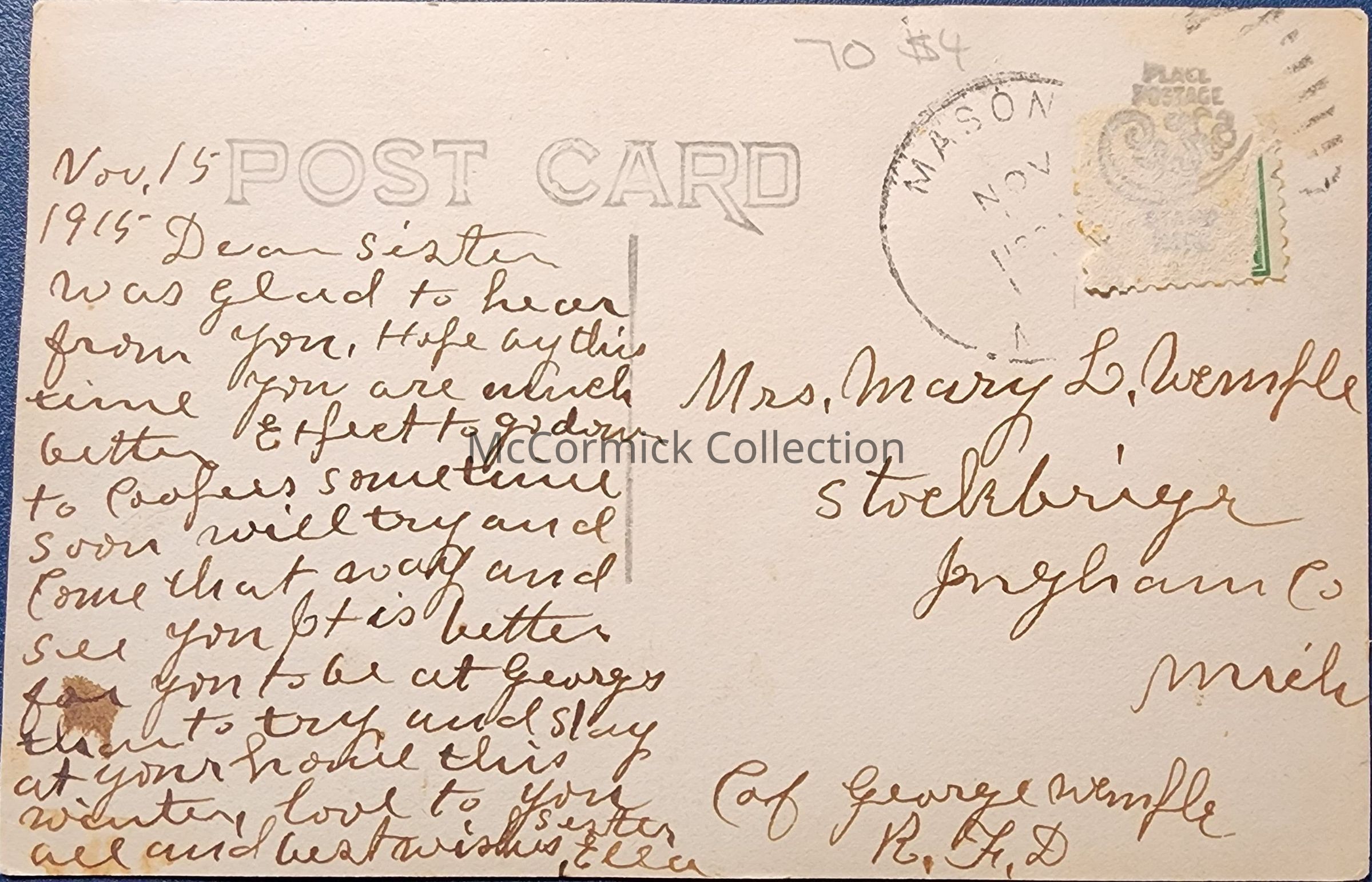 Real photo postcard of a house in Mason, Michigan. Postally used, 1915 Mason postmark. Addressed to Stockbridge.