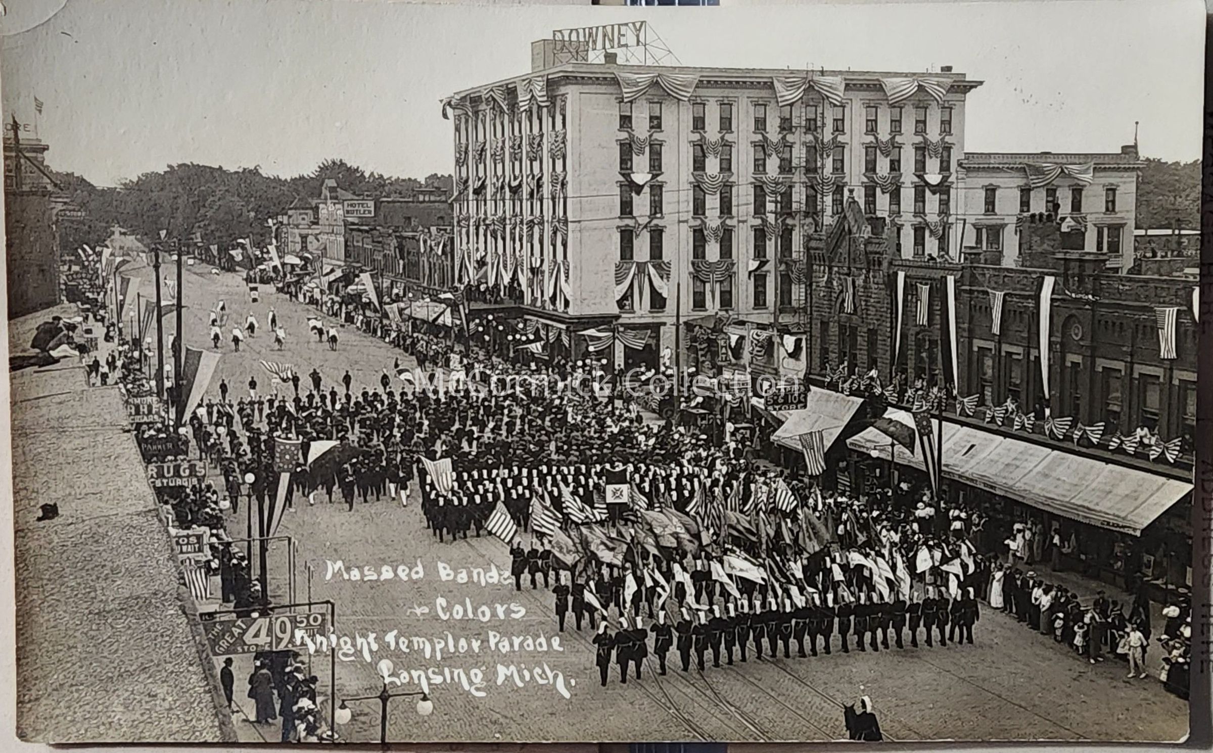 Real photo postcard of Massed bands and colors in the Knights Templar Parade on Washington Avenue in Lansing. The Downey Hotel is in the background. Postally unused.