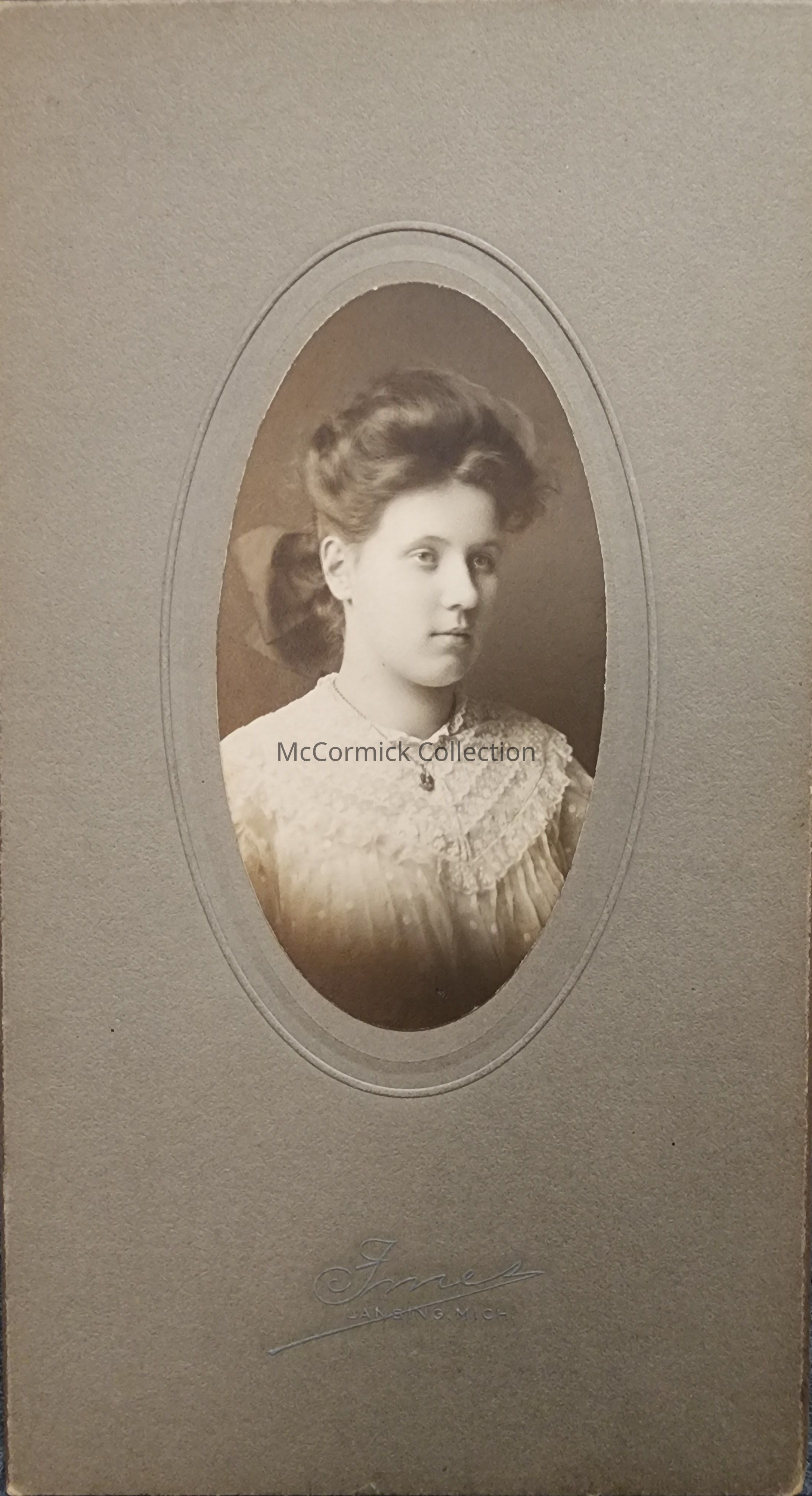 Card mounted photograph of Maude Huxtable by Lansing photographer Imes.