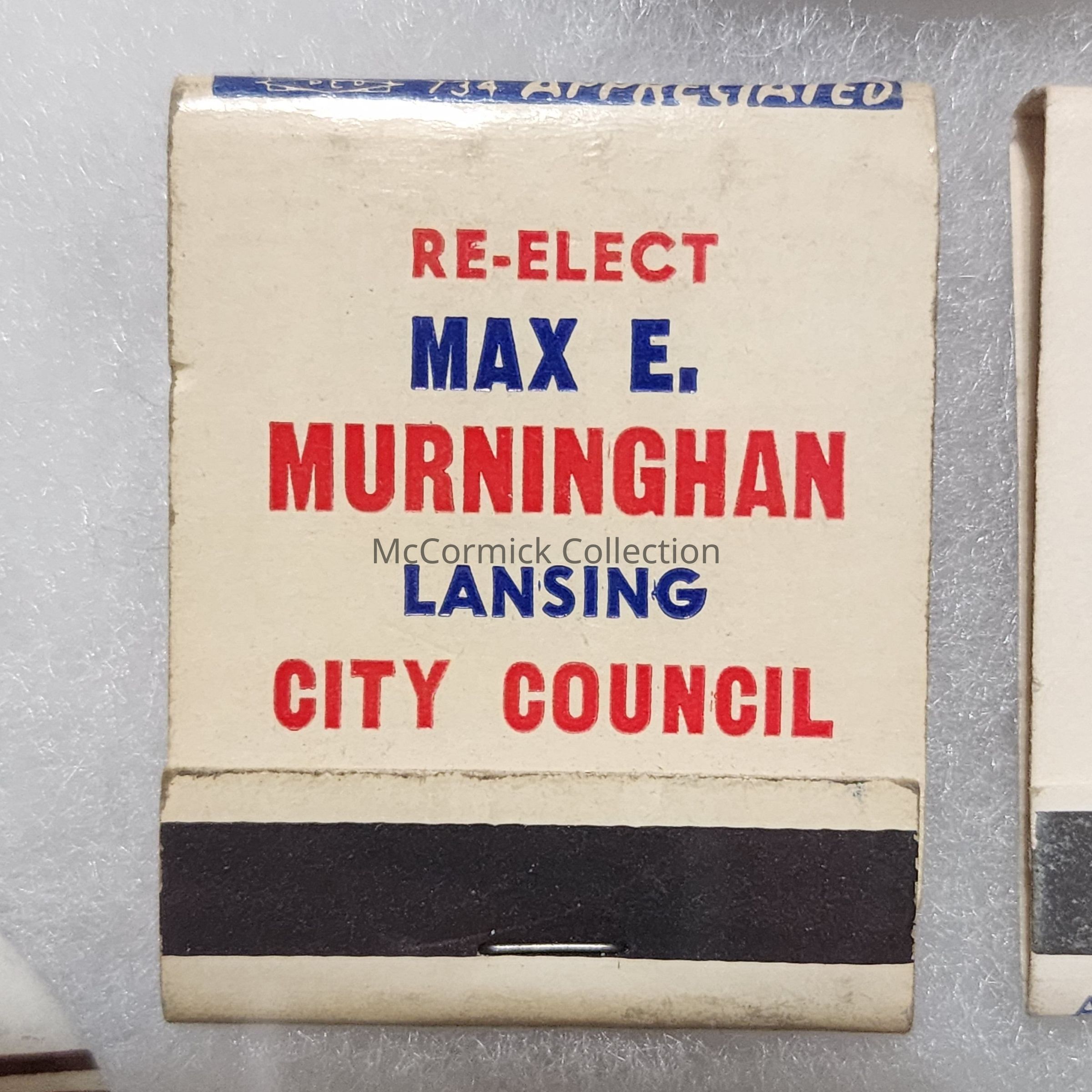 A red, white, and blue political matchbook for Max Murninghan for Lansing City Council.