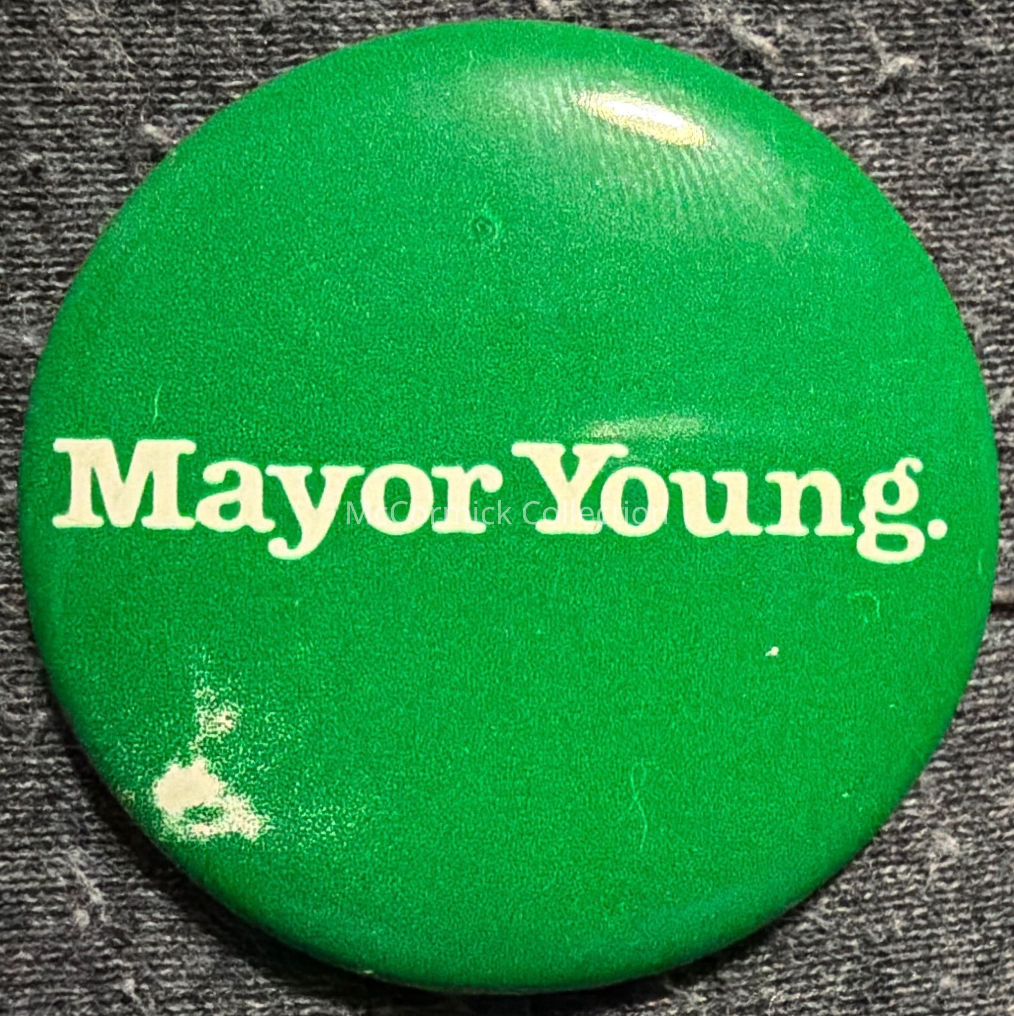 A 1.75” green and white political button for Coleman Young for Mayor of Detroit. From the Kingdon collection.