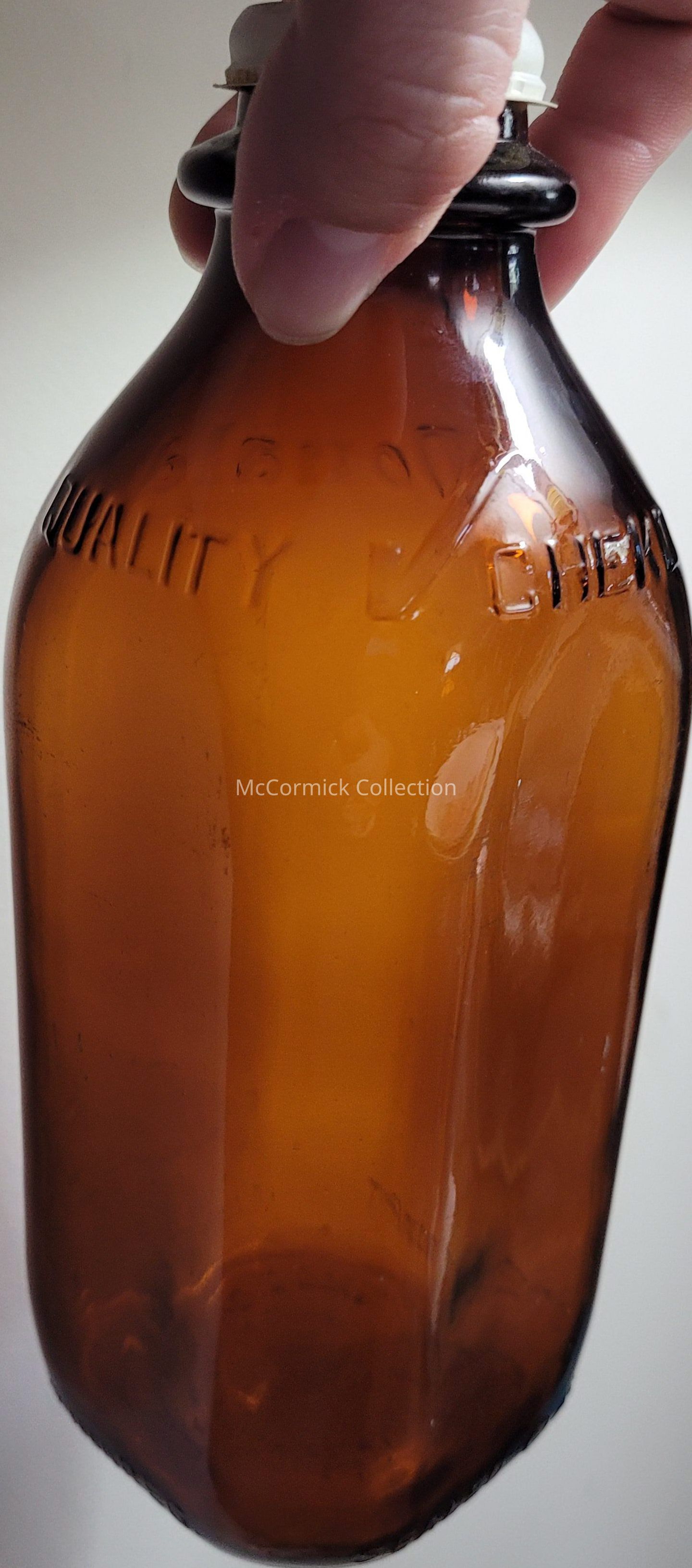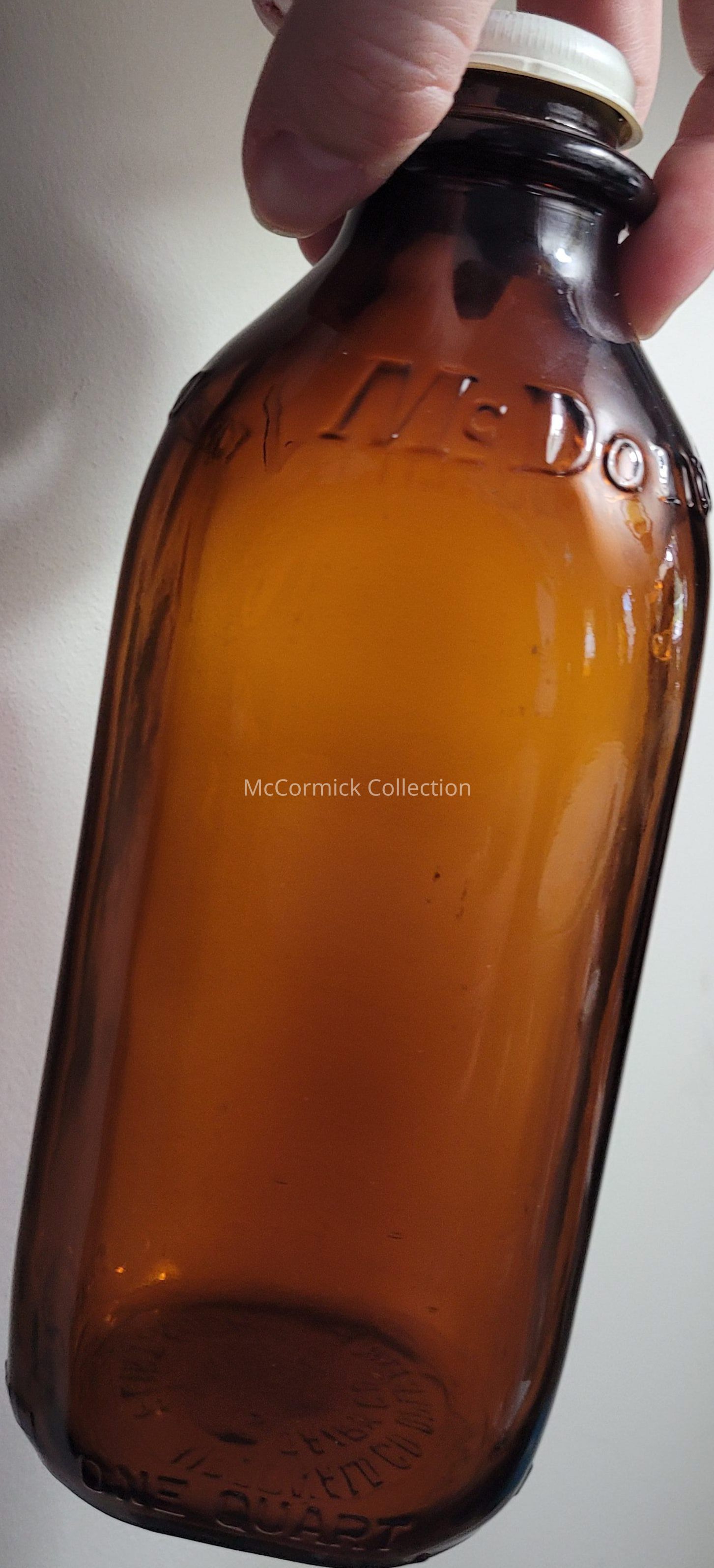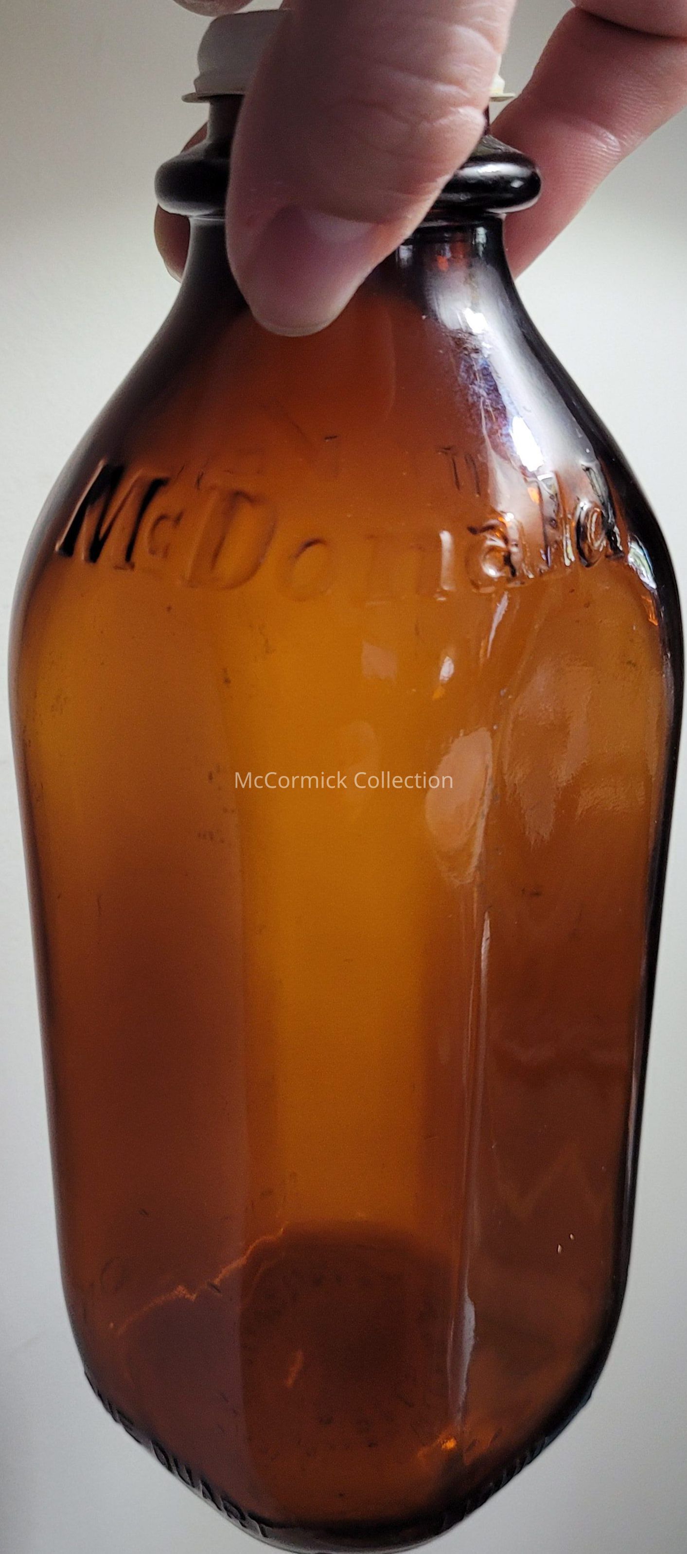 An amber embossed square quart bottle from McDonald Dairy with logo embossed on shoulder and "Quality Checkd" slogan on other side.