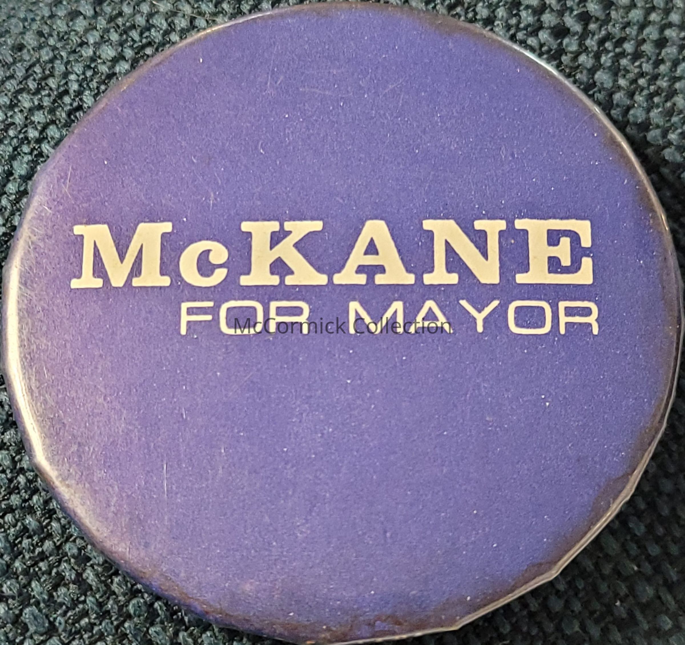 A 2.25" blue and white political button for Terry McKane for Mayor of Lansing, circa 1980s.