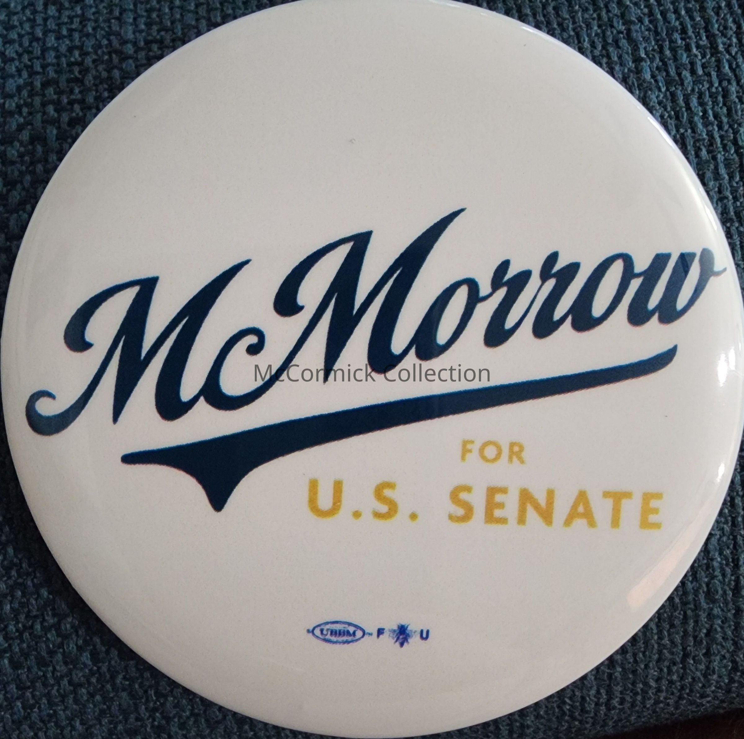 A 3" white, blue, and yellow political button for Michigan state senator Mallory McMorrow for U.S. Senate, 2026.