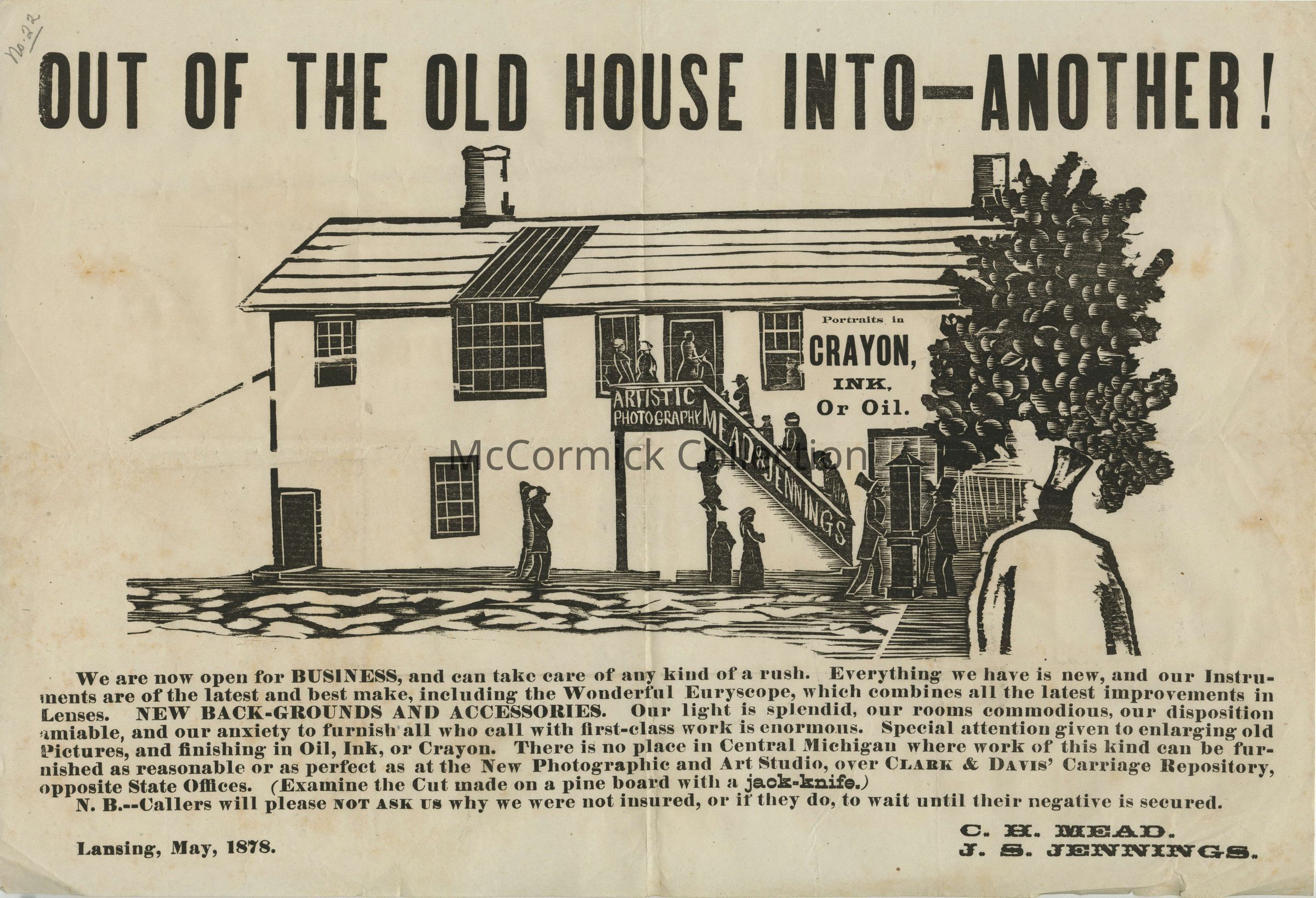 A broadside with a woodcut illustration from the Mead and Jennings photo and art studio in Lansing, dated May 1878. The image is titled "Out of the Old House into - another!" It discusses insurance after the studio fire and relocating from East Michigan to South Washington Avenues.