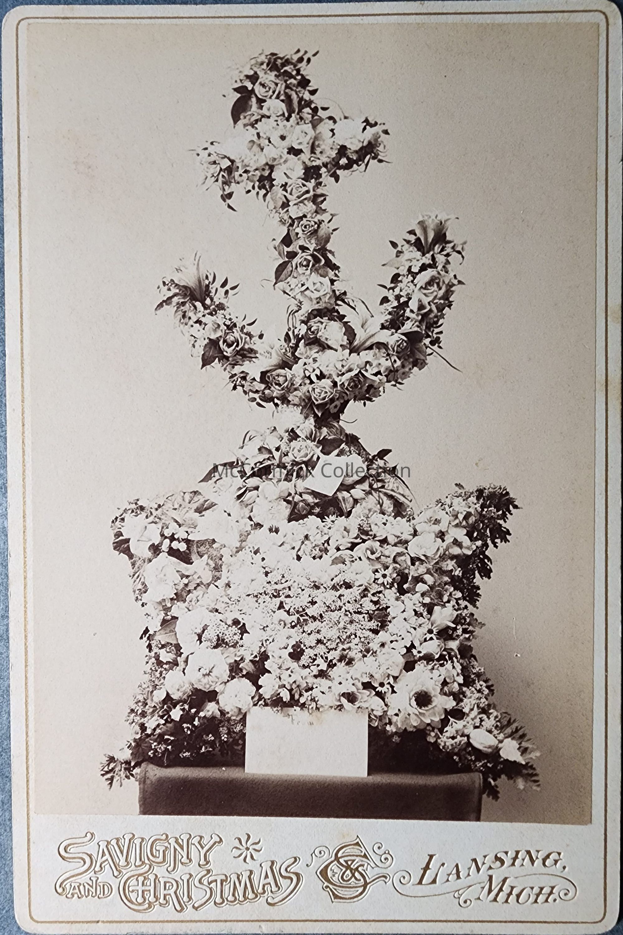Cabinet card photograph of memorial flower arrangements by Lansing photographer Savigny and Christmas.