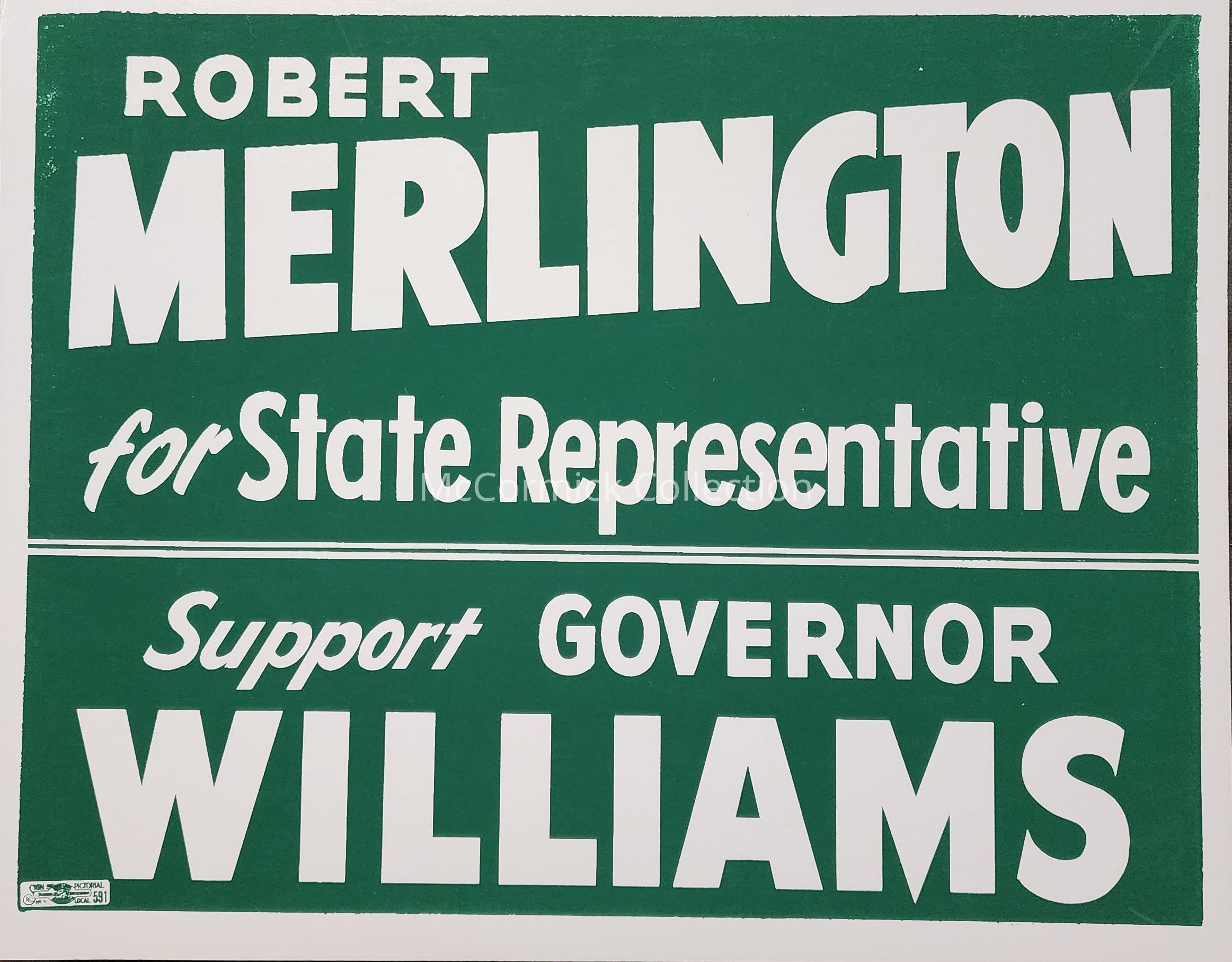 Coattail poster for Robert Merlington for State Representative and G. Mennen Williams for Governor. Merlington was an unsuccessful candidate from Kent County. Circa 1954.
