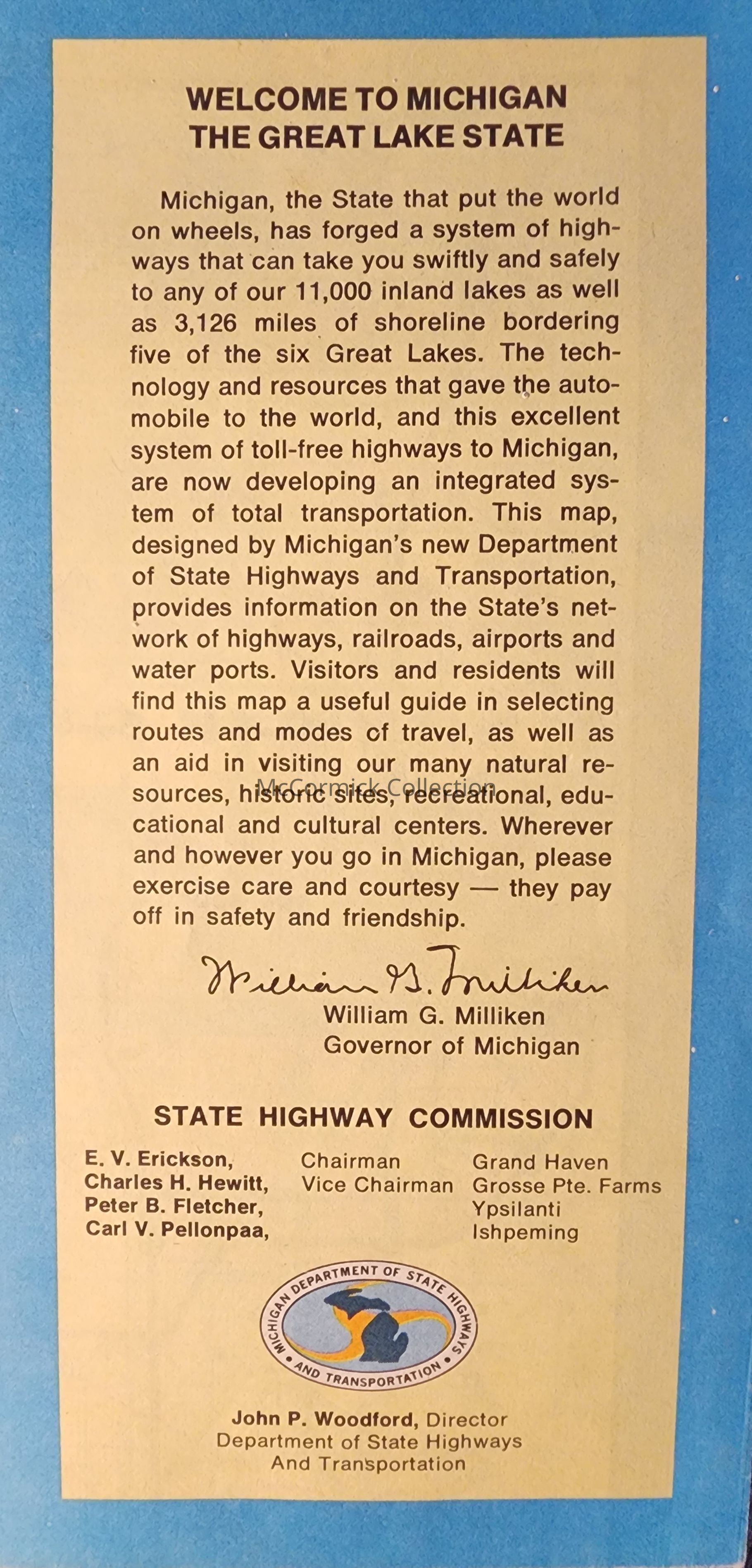Michigan State Highway Commission map. Governor William Milliken listed.