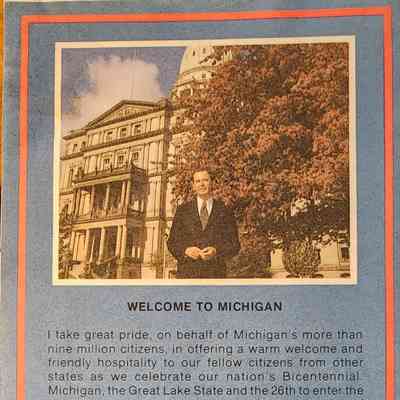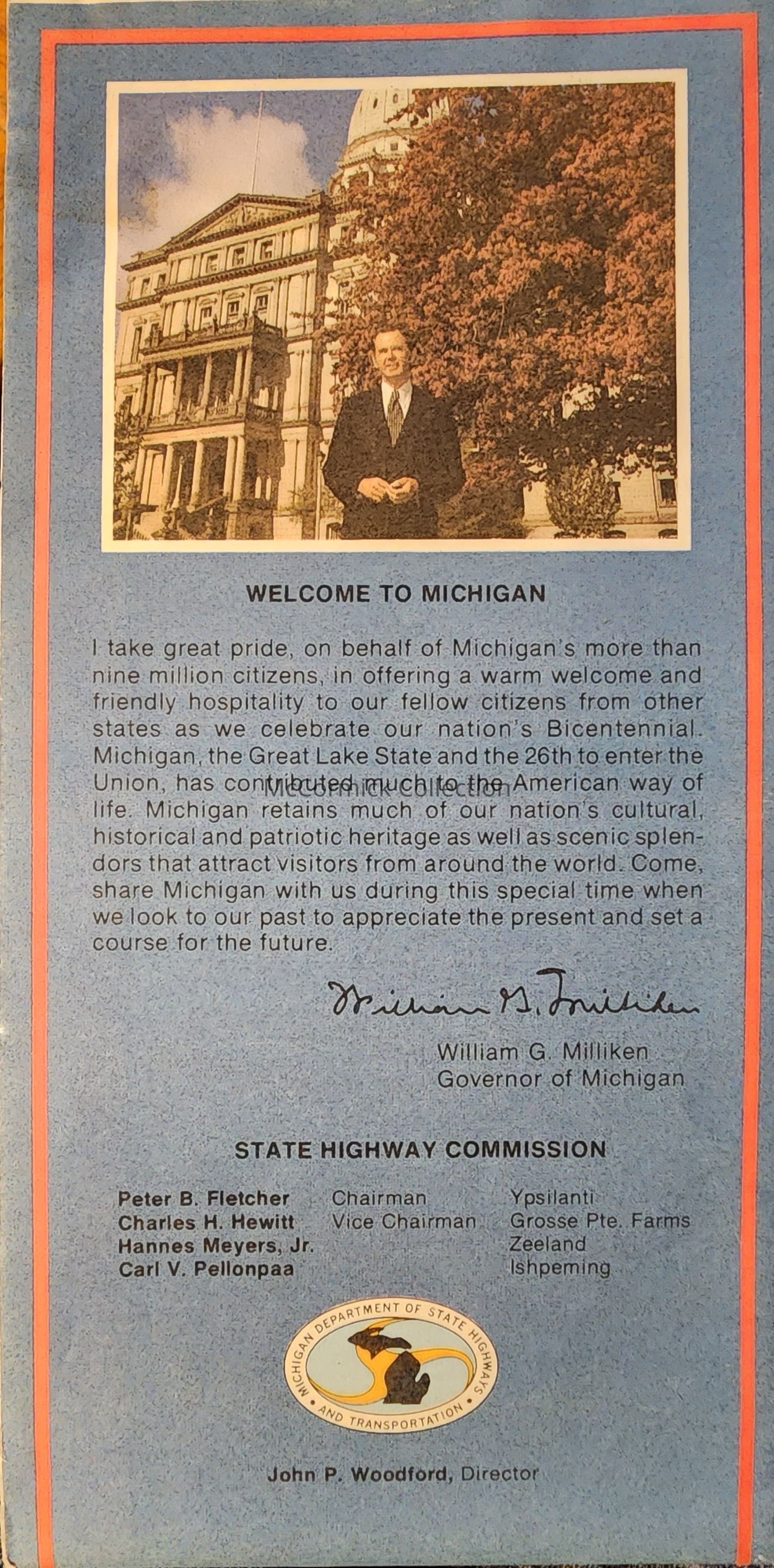 Michigan State Highway Commission map. Governor William Milliken listed. Bicentennial theme.