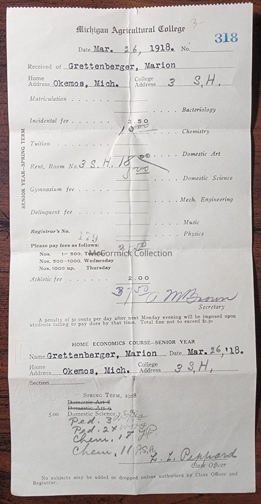 A bill or fee sheet for Marion Grettenberger of Okemos to attend Michigan Agricultural College in 1918 for Home Economics.