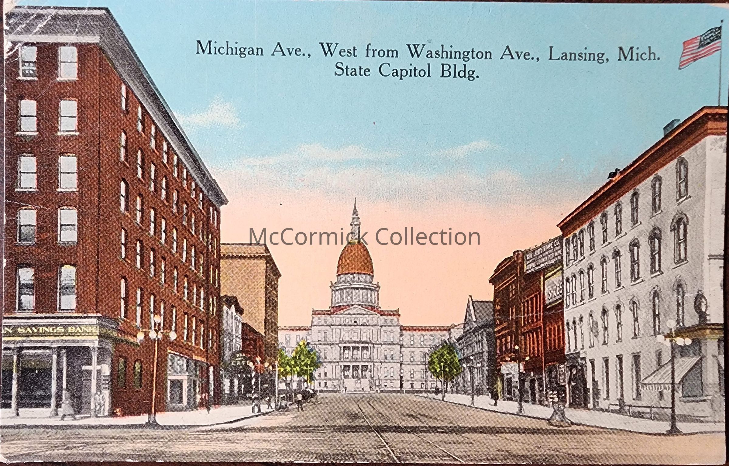 Michigan Ave., West from Washington Ave., Lansing, Mich. State Capitol Bldg. Postcard