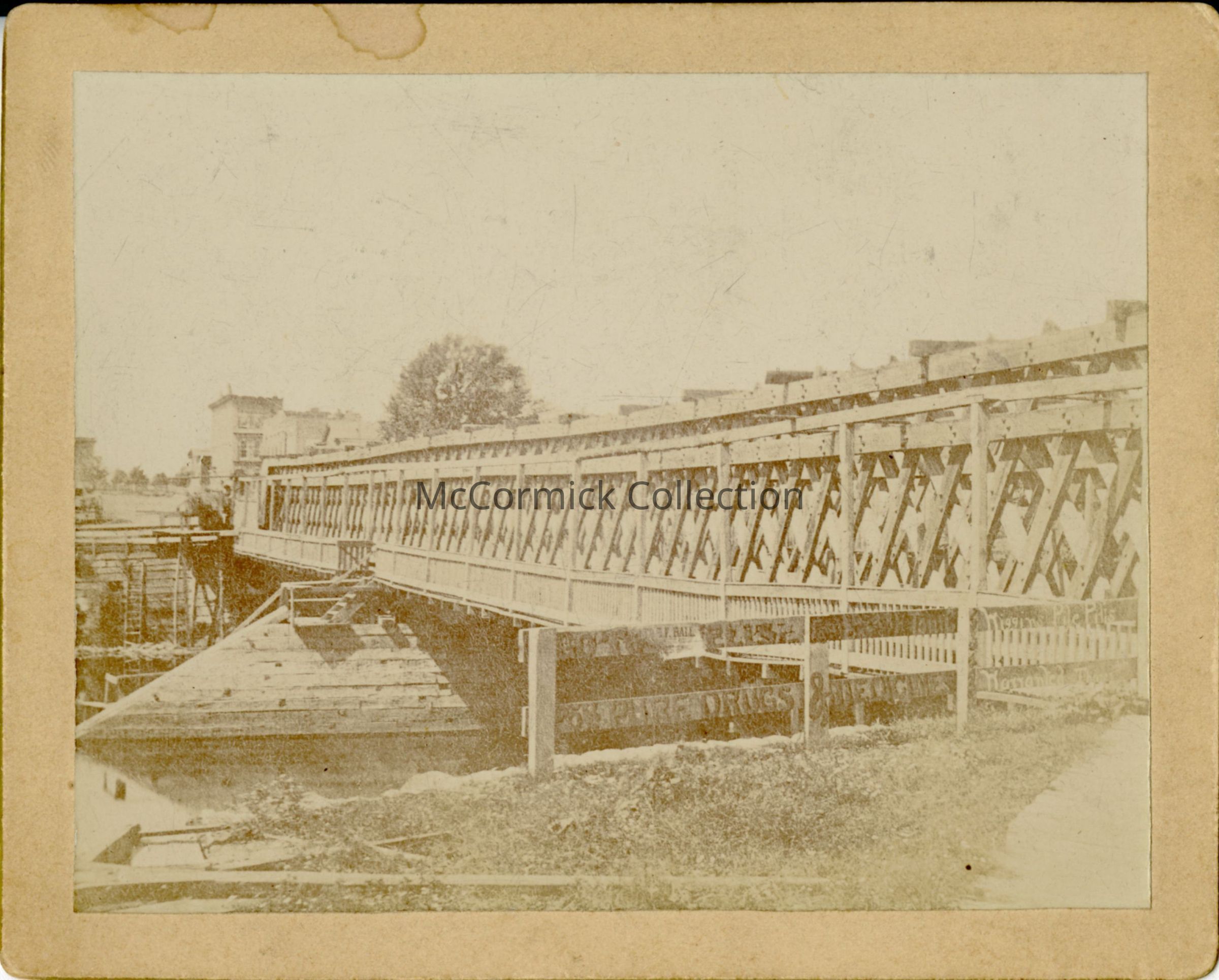 Card mounted photograph of the Michigan Avenue bridge over the Grand River in Lansing, Michigan. In the background is downtown Lansing. Photo by Lansing photographer Curran, but likely just printed by him from an older negative (possibly from Scotford or Mead).