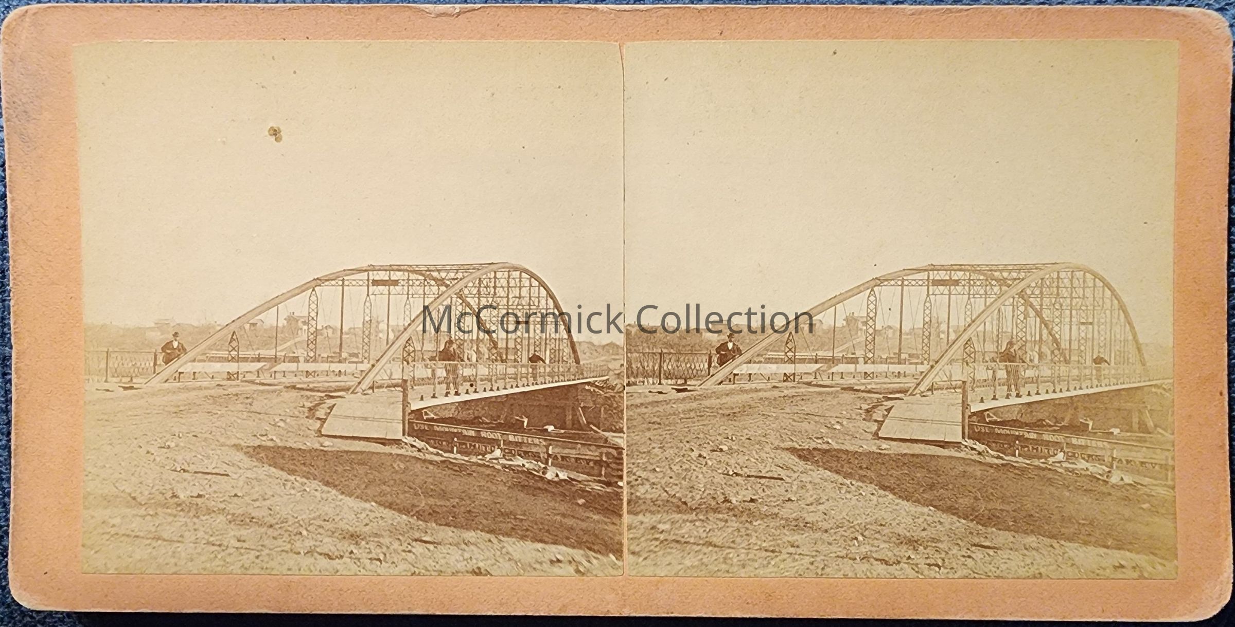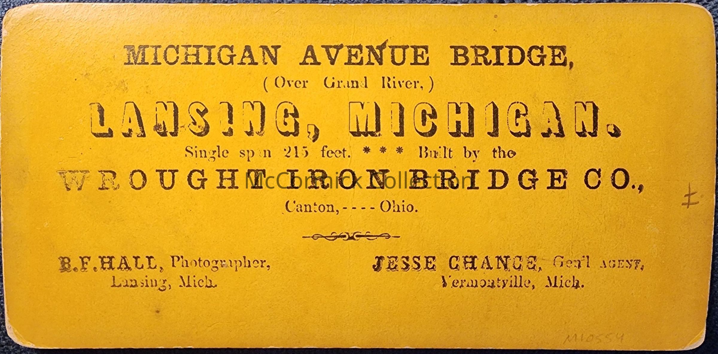 Stereograph of the Michigan Avenue Bridge over the Grand River in Lansing, Michigan. The back imprint of the card reads: "Michigan Avenue Bridge (Over Grand River,) Lansing, Michigan. Single span 215 feet. Built by the Wrought Iron Bridge Co., Canton, Ohio. B.F. Hall, Photographer, Lansing, Mich., Jesse Chance, Gen'l Agent, Vermontville, Mich." Pink card front mounting, back is yellow.