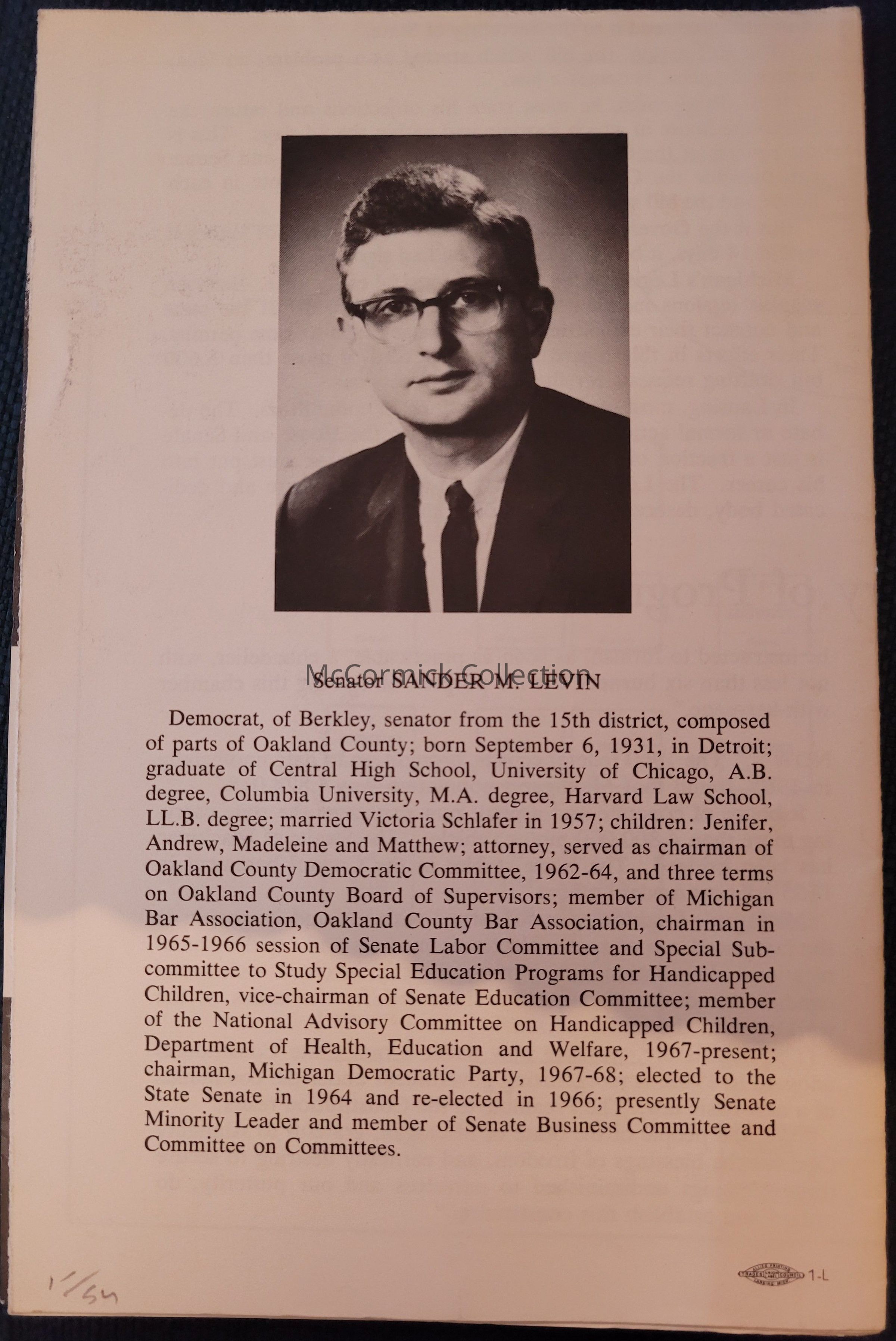 A booklet for visitors to the Michigan State Capitol distributed by State Senator Sander Levin, circa 1960s.
