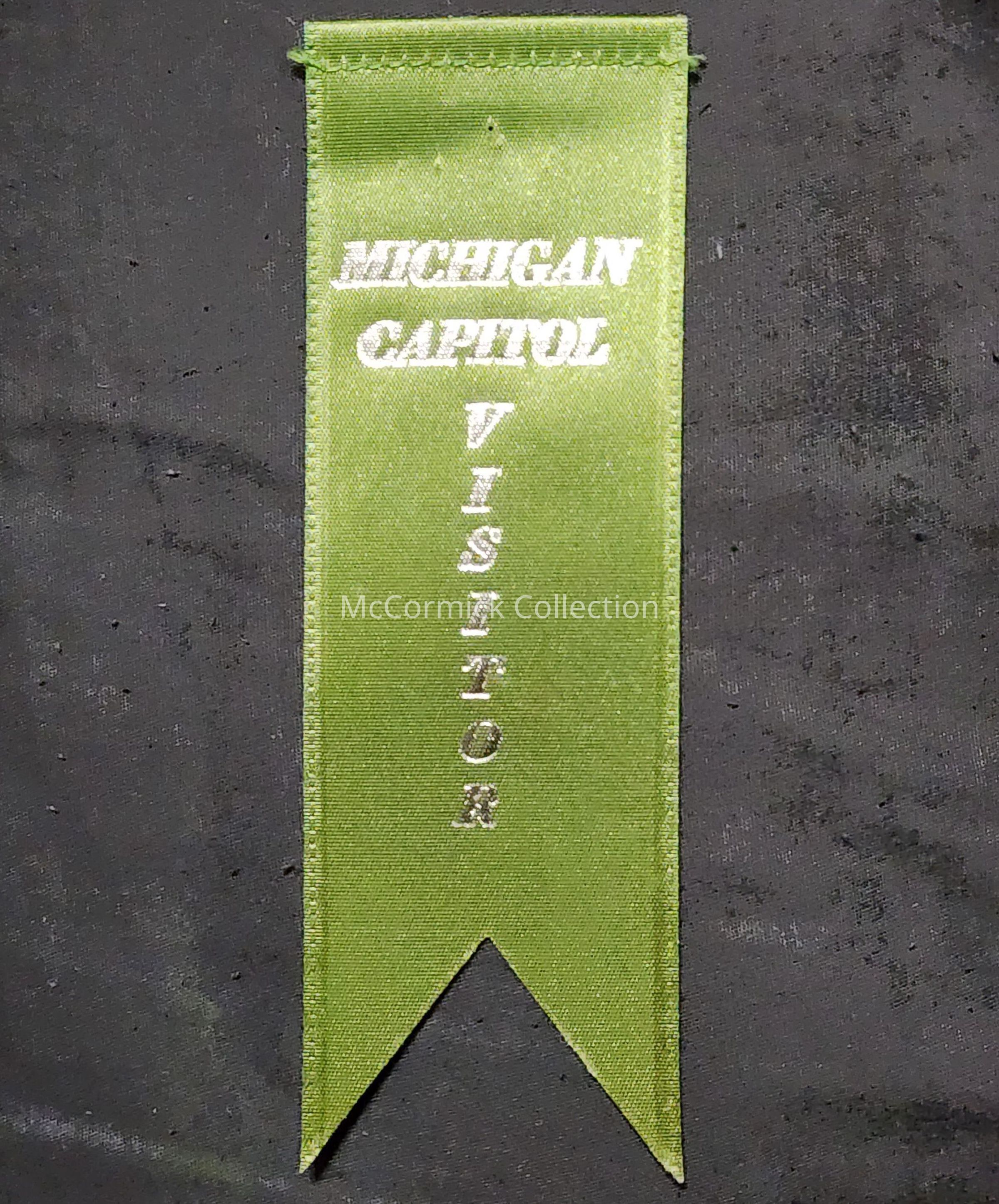A green and silver swallow tail ribbon badge for visitors to the Michigan State Capitol, circa 1970s.