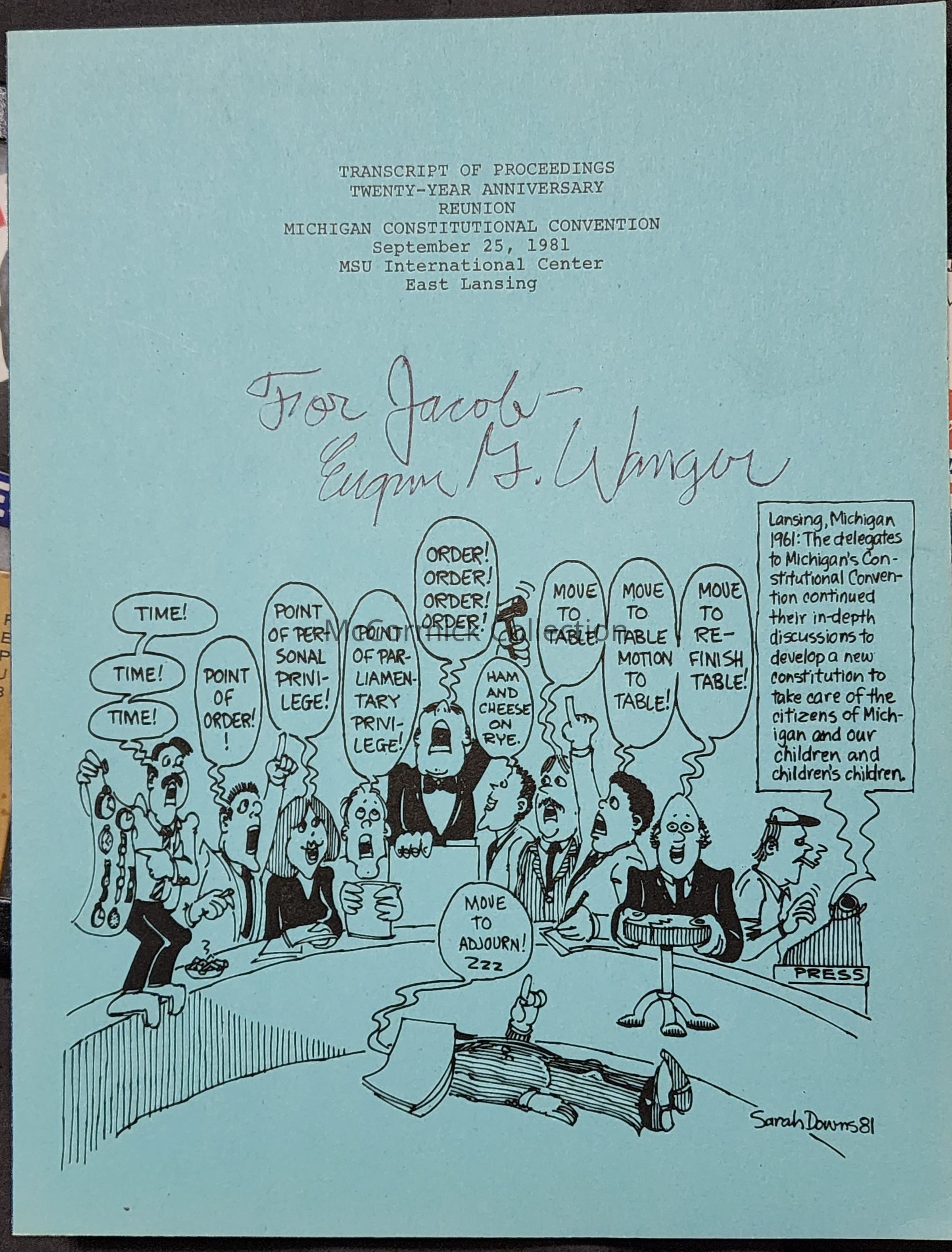 A soft cover bound publication issued to participants of the 1981 20th anniversary reunion of the 1961 Constitutional Convention. Inscribed to me by Lansing delegate Eugene G. Wanger in July 2023.