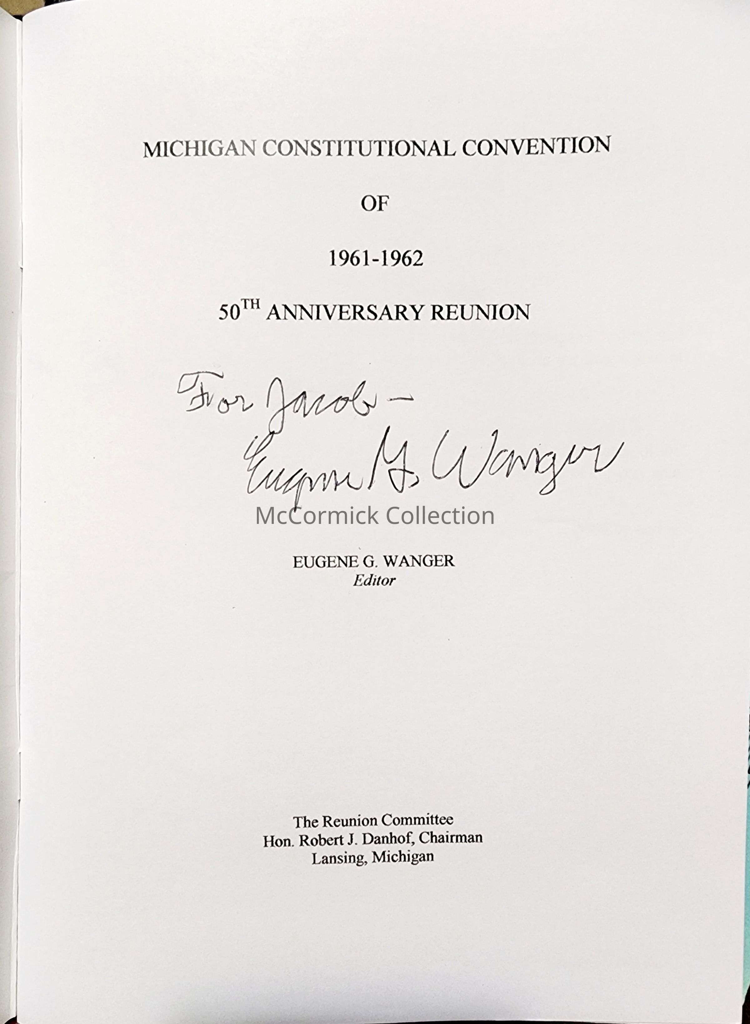 A soft cover bound publication issued to participants of the 2011 50th anniversary reunion of the 1961 Constitutional Convention. Inscribed to me by Lansing delegate Eugene G. Wanger in July 2023.