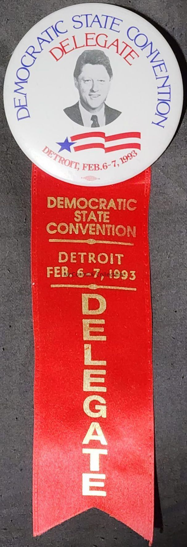 A badge, button and ribbon, worn by a delegate to the 1993 Michigan State Democratic Party Convention in Detroit. Bill Clinton is pictured on the button, coinciding with his run for president.