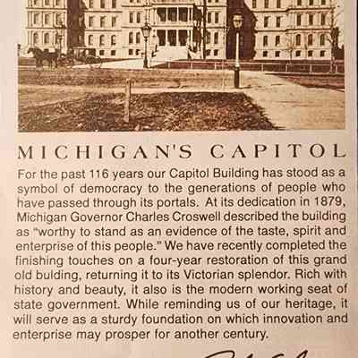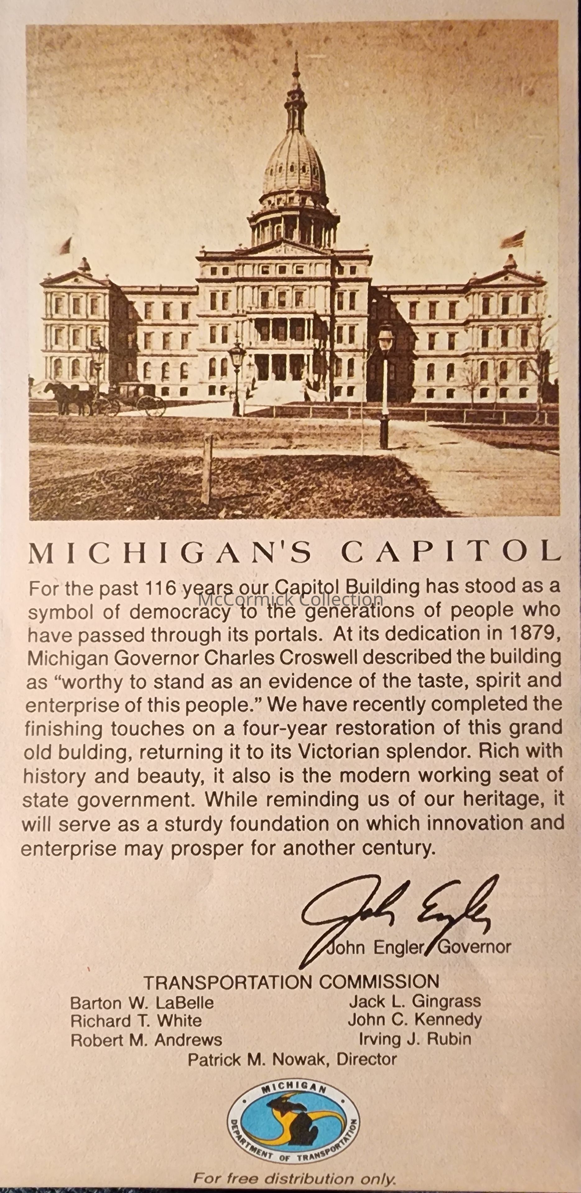 Michigan State Transportation (Highway) Commission map. Governor John Engler listed. Undated, but circa 1993, features the Michigan State Capitol restoration.