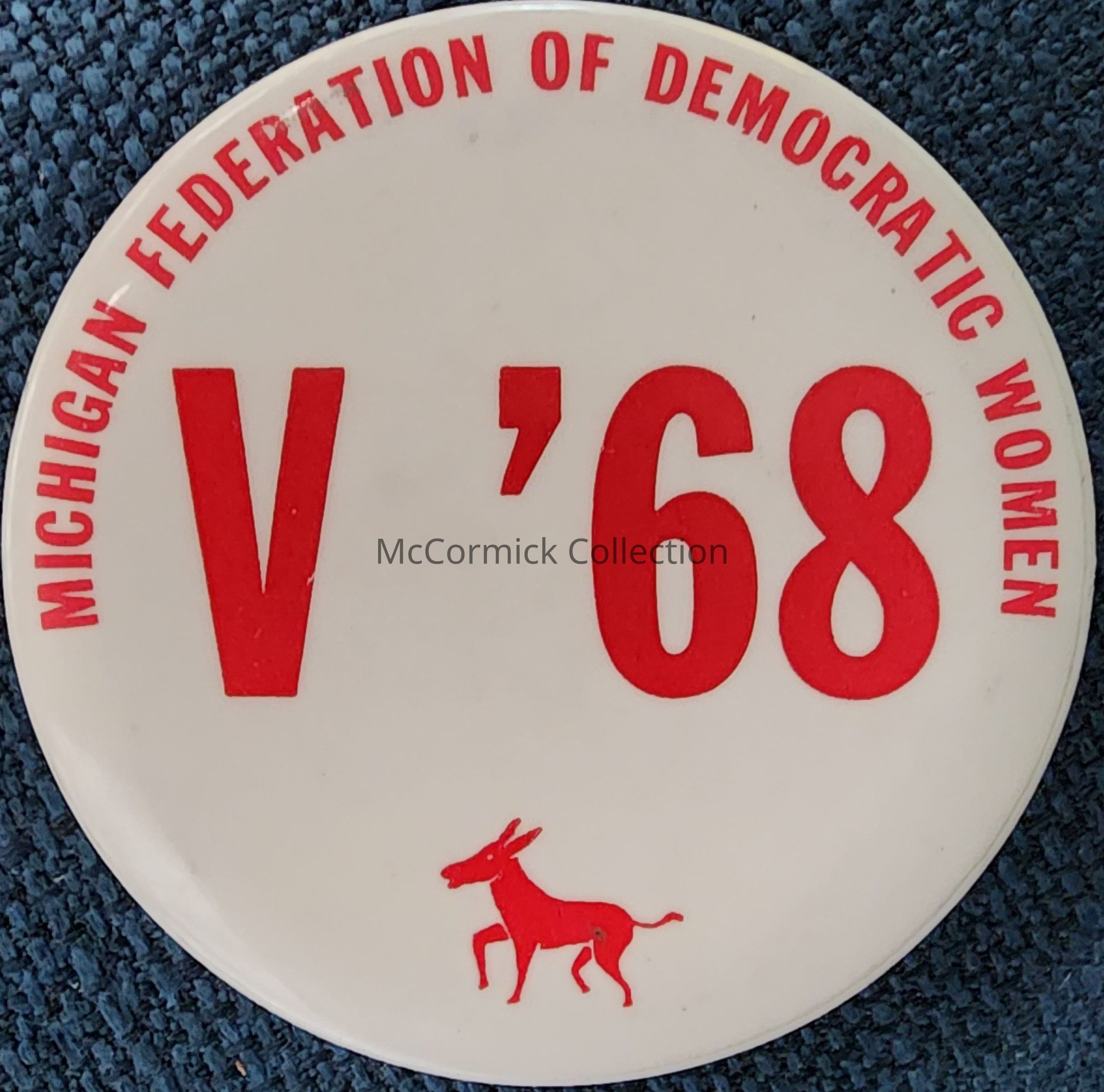 A 2.25" red and white political button from 1968 for the Michigan Federation of Democratic Women. Donkey symbol.