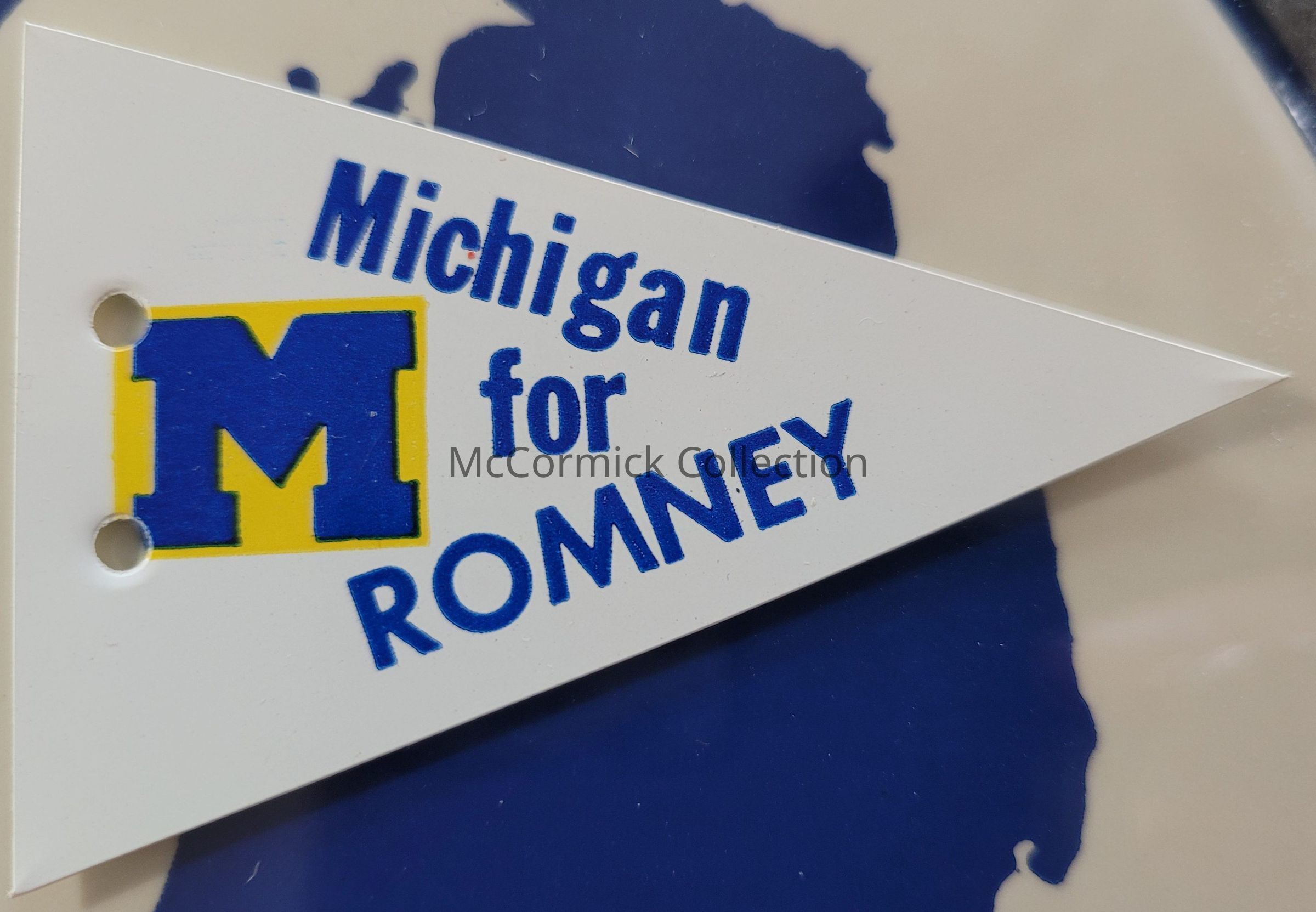 A 3" long plastic flag for the University of Michigan for Romney, circa 1960s.