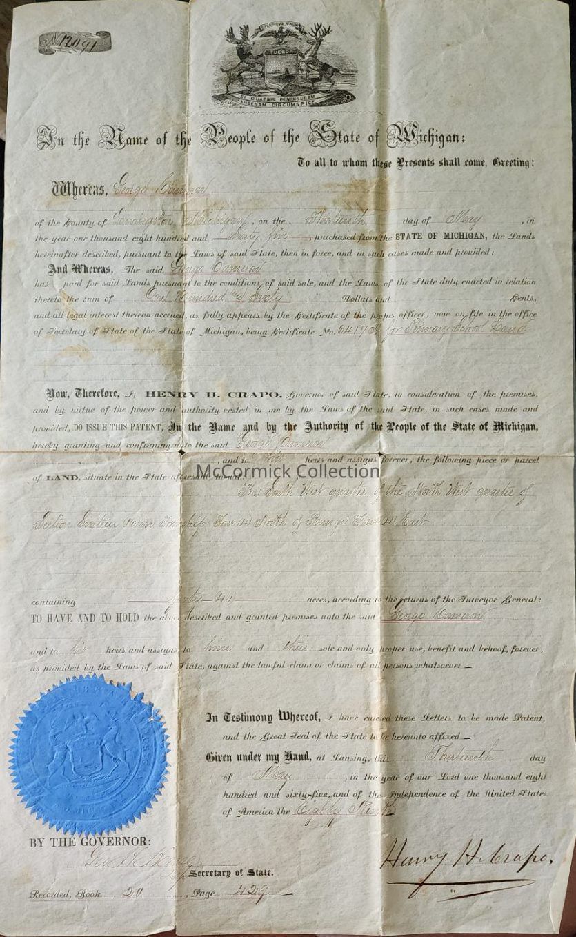 A Michigan land grant for George Cameron of Livingston County, signed by Governor Henry H. Crapo, 1865.