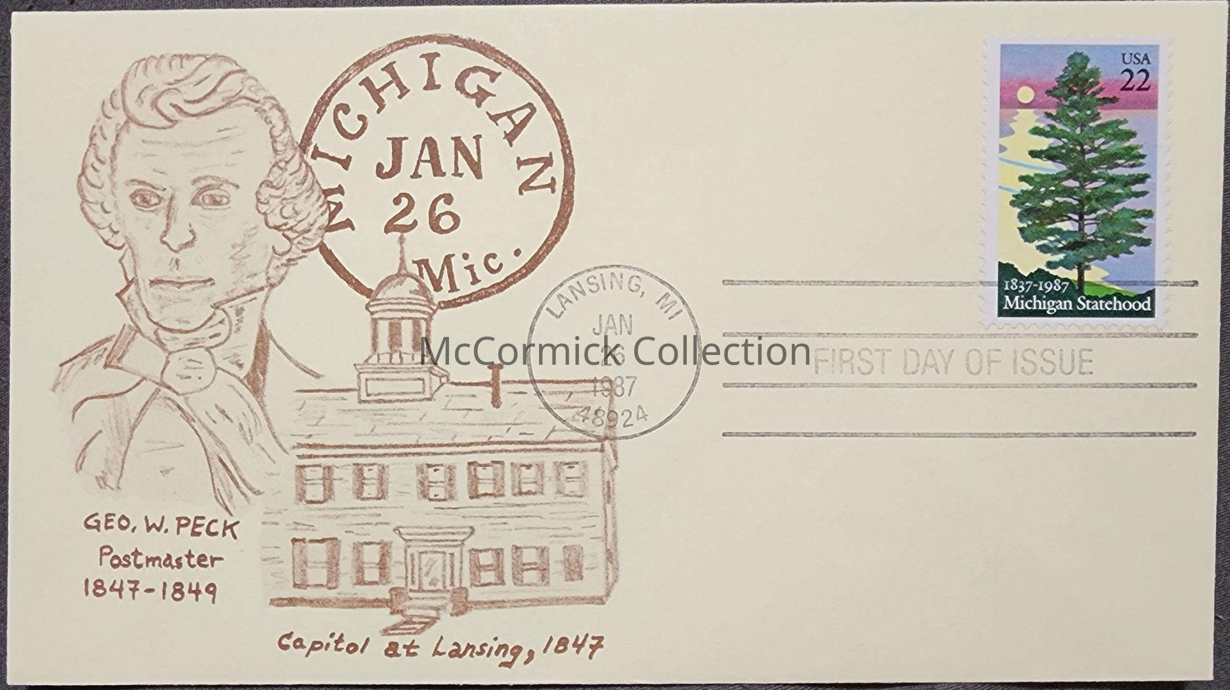 A 1987 postal cover featuring Postmaster George W. Peck, Lansing's first capitol, and a Michigan, Mich. postmark. First day issue, January 26, 1987, Michigan Sesquicentennial. Statehood stamp.