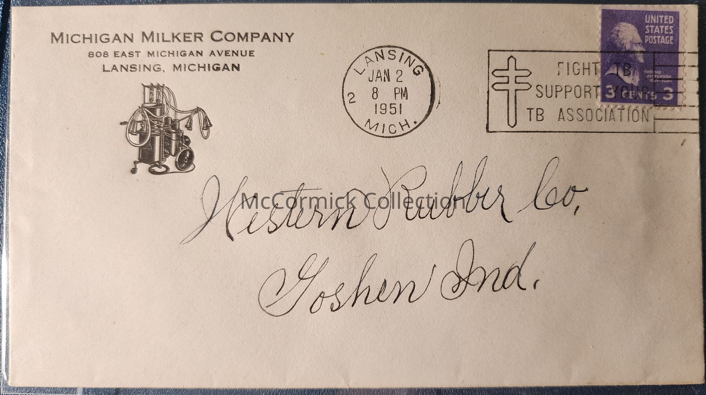Advertising postal cover for the Michigan Milker Company. Postmarked 1951 Lansing.