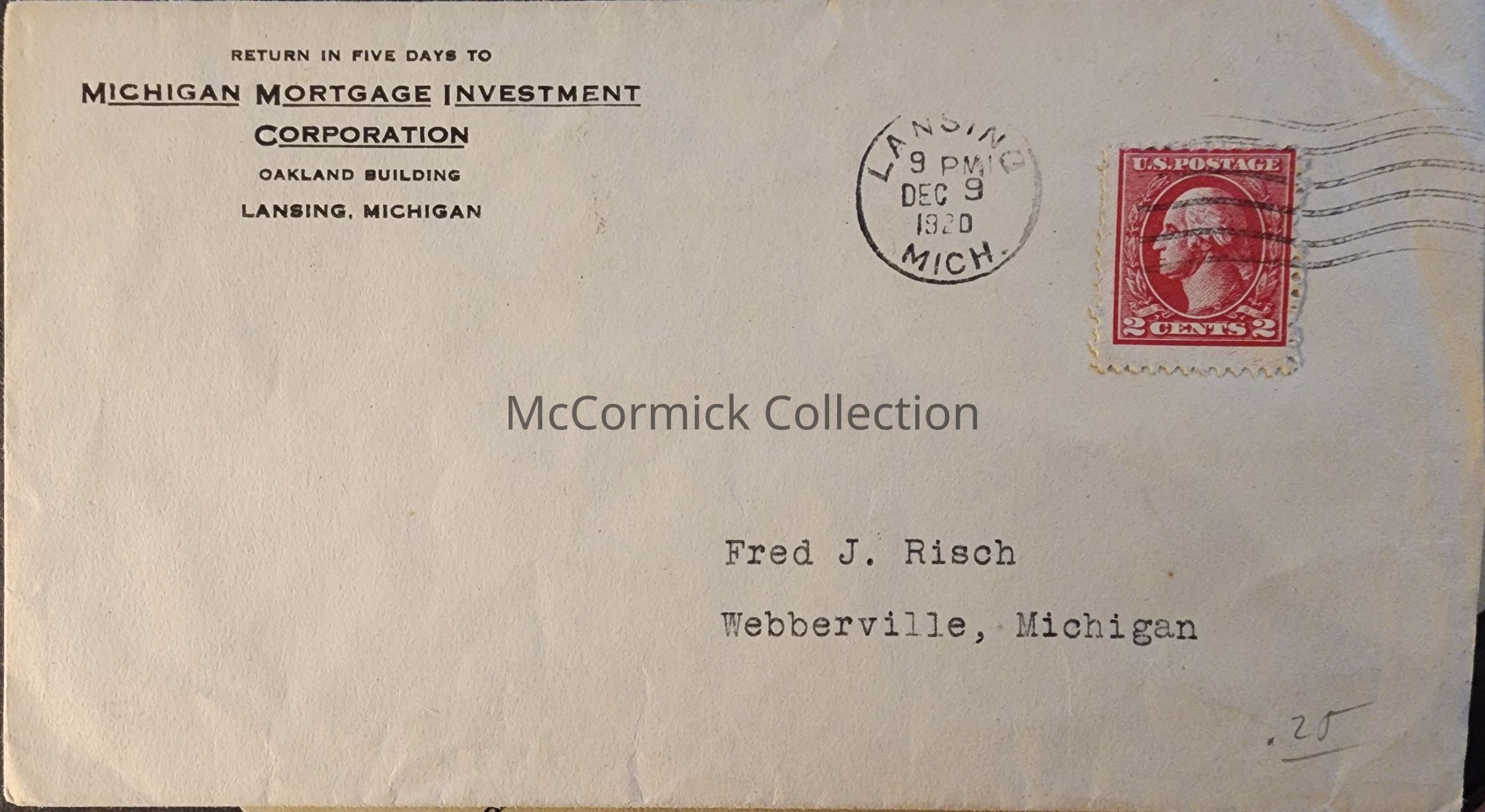 Michigan Mortgage Investment Corporation, Lansing, Michigan, 1920, Postal Cover
