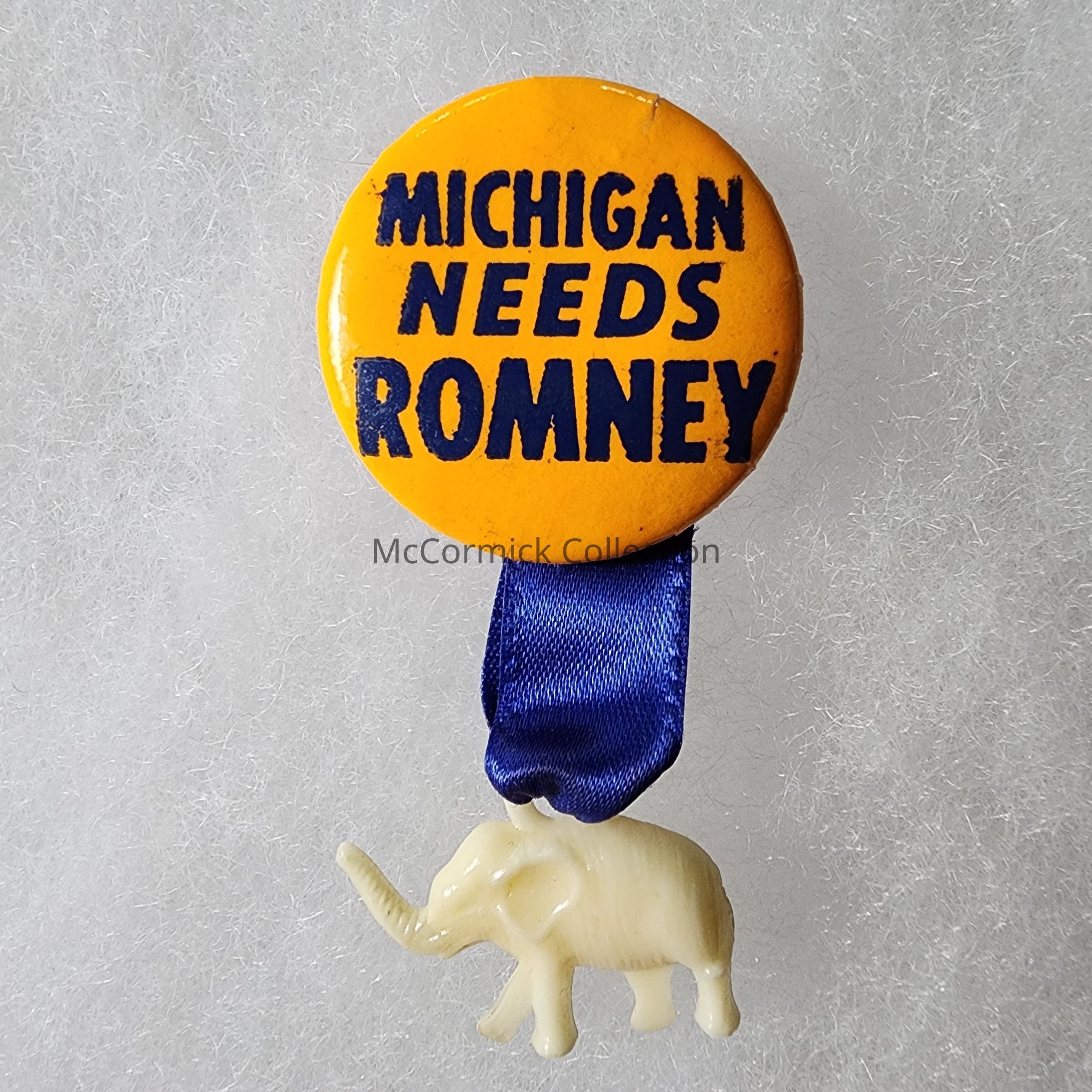 A 1.25" orange and blue political button for George Romney for Governor of Michigan, "Michigan Needs Romney" slogan, with blue ribbon and plastic elephant dangle.