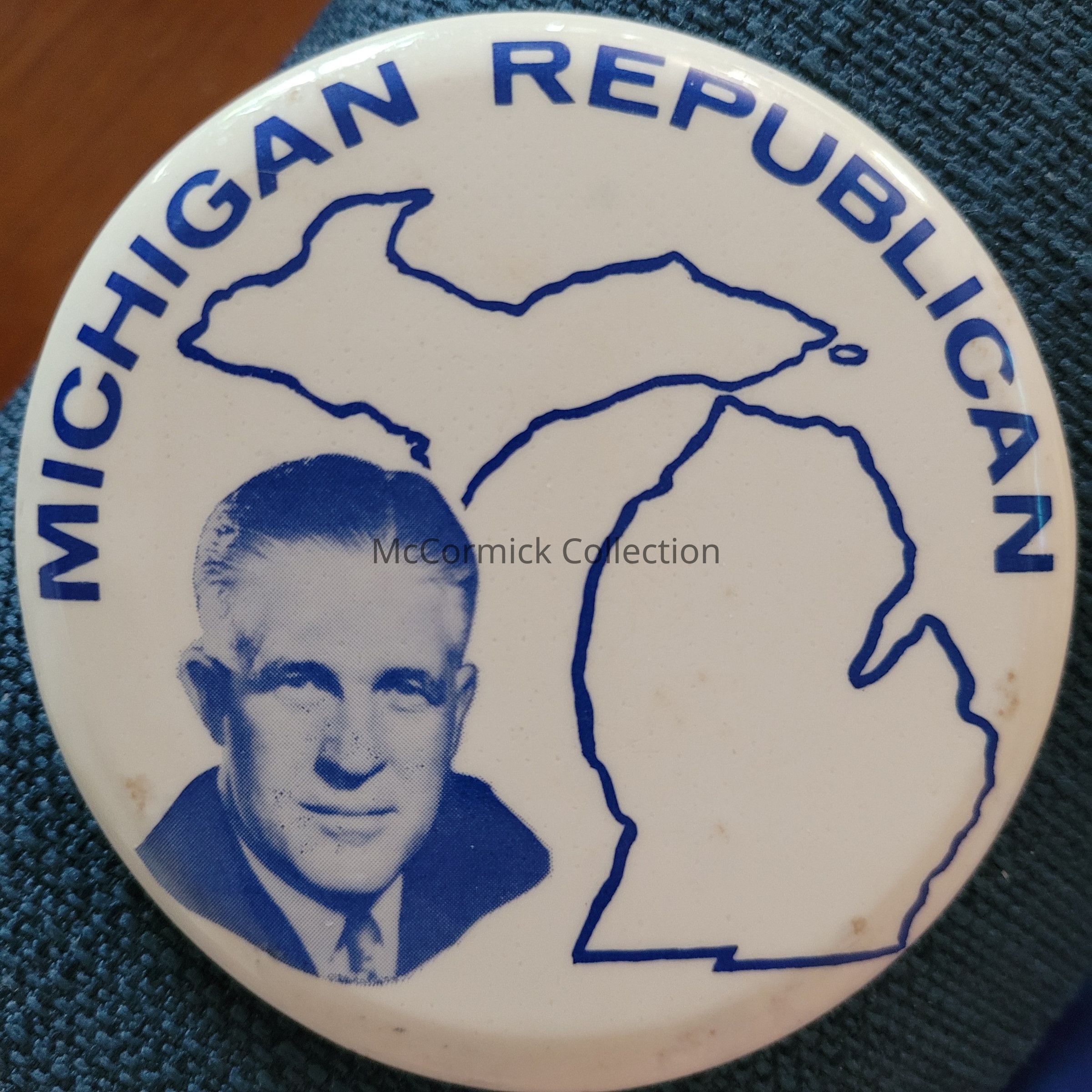Michigan Republican button, 3". Part of a pair in this style, this button features a photo of Governor George Romney with a state outline in blue and white.